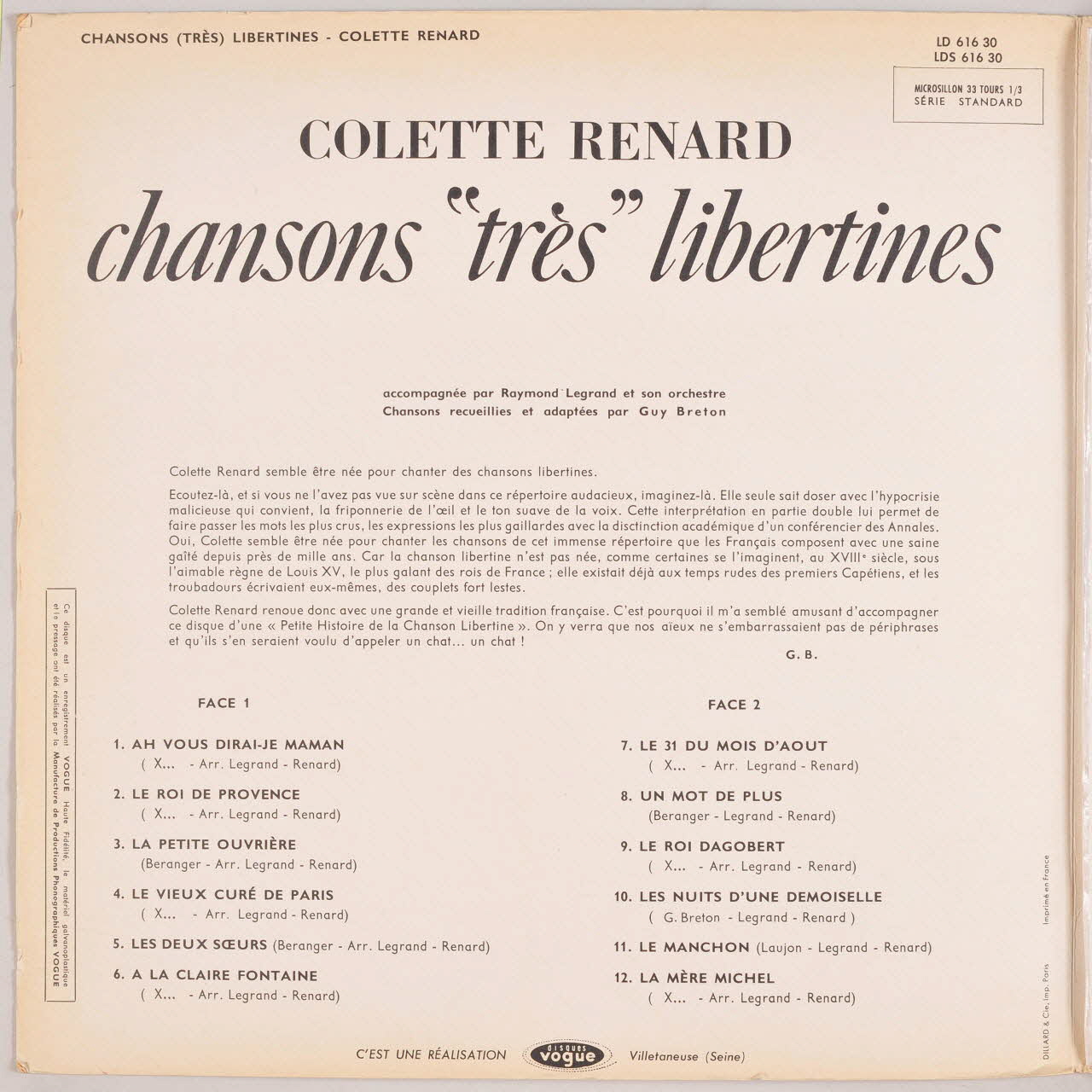 disque 33 tours, Le vieux curé de Paris, Le roi Dagobert, Ah ! Vous dirais-je maman, Les deux soeurs, Le 31 du mois d'août, Les nuits d'une demoiselle, Chansons "très" libertines, La mère Michel, A la claire fontaine, Le roi de Provence, Un mot de plus, Le manchon, La petite ouvrière