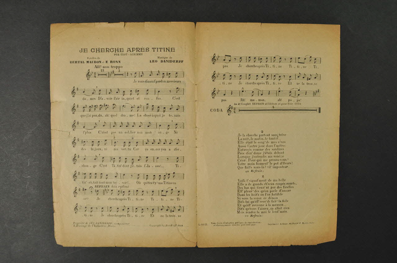 Les inscriptions renseignent le titre de la chanson, le nom des auteurs, de l'artiste et de l'éditeur. A l'intérieur se trouvent la partition et les paroles de la chanson. Le dos est laissé vierge.Décor
