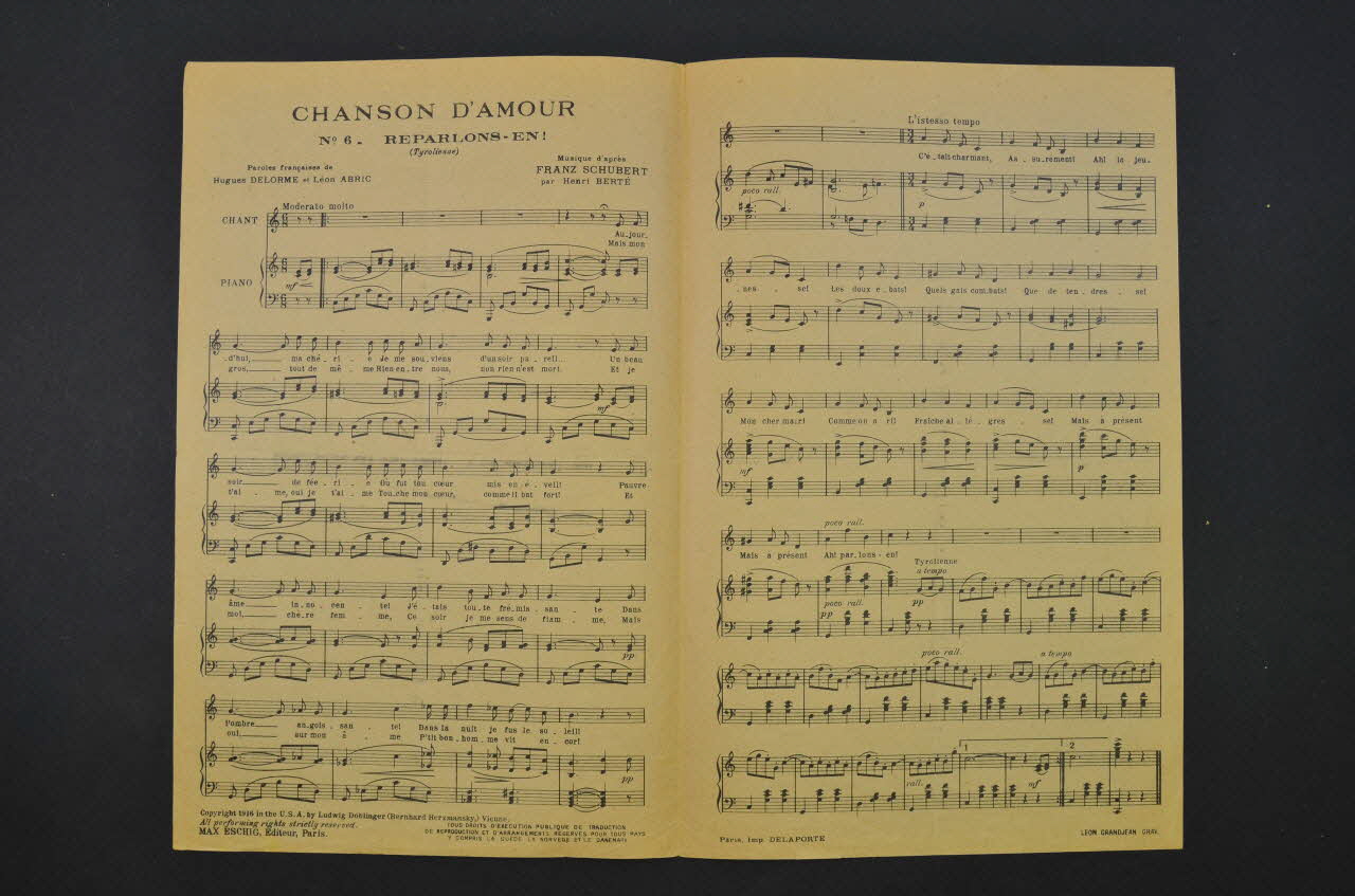 Les inscriptions renseignent le titre de la chanson, le nom des auteurs, de l'artiste et de l'éditeur. A l'intérieur, partitions et paroles de la chanson. Au dos, liste d?autres partitions publiées par l?éditeur.Matériaux et techniques
