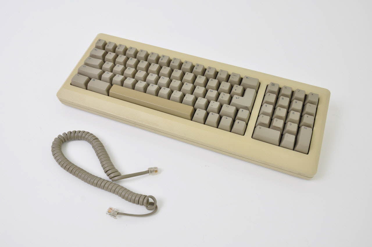 Ce clavier en plastique beige de forme rectangulaire comporte des touches grises diverses avec des inscriptions en noir sur l'ensemble de la face supérieure.