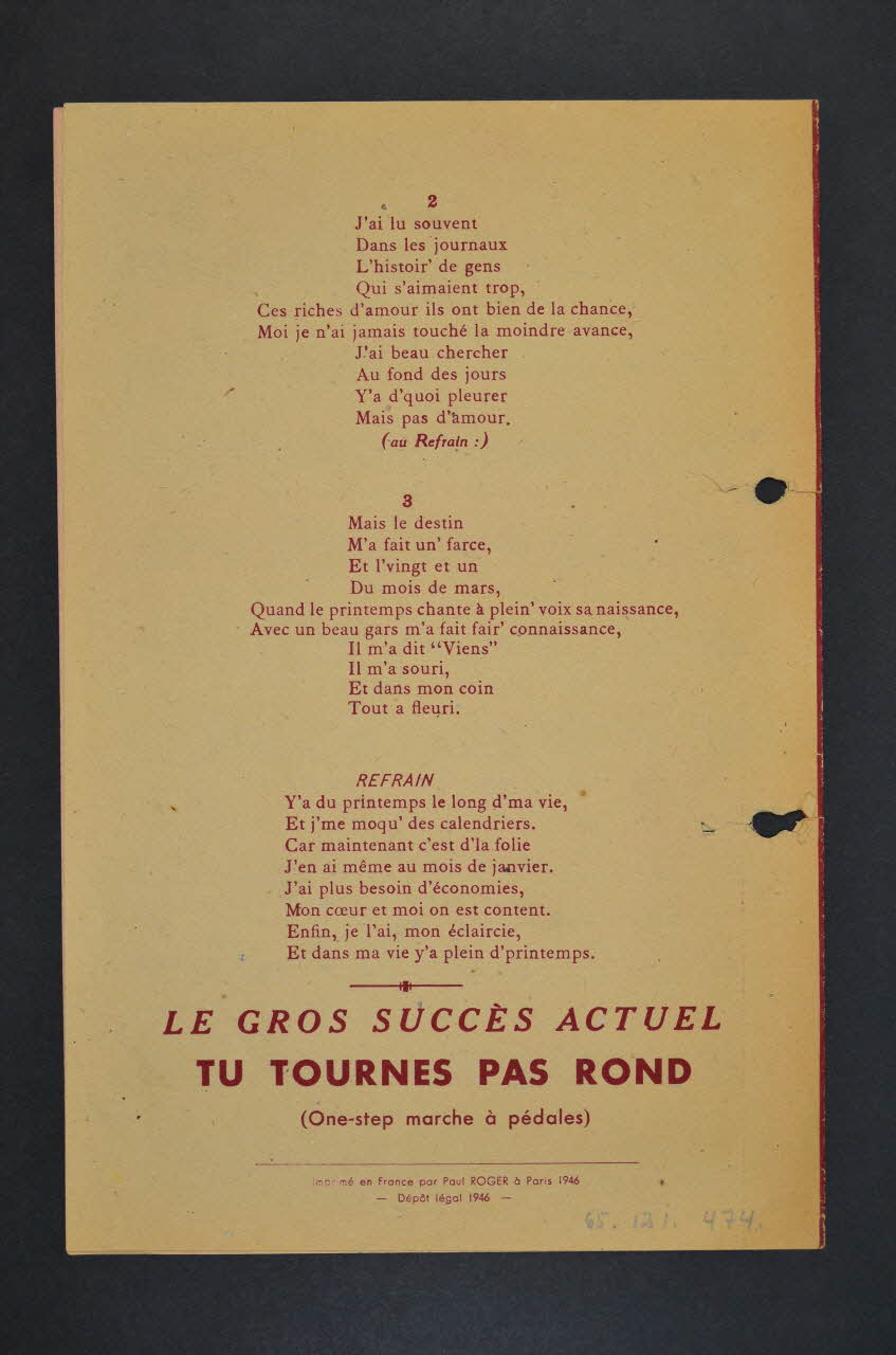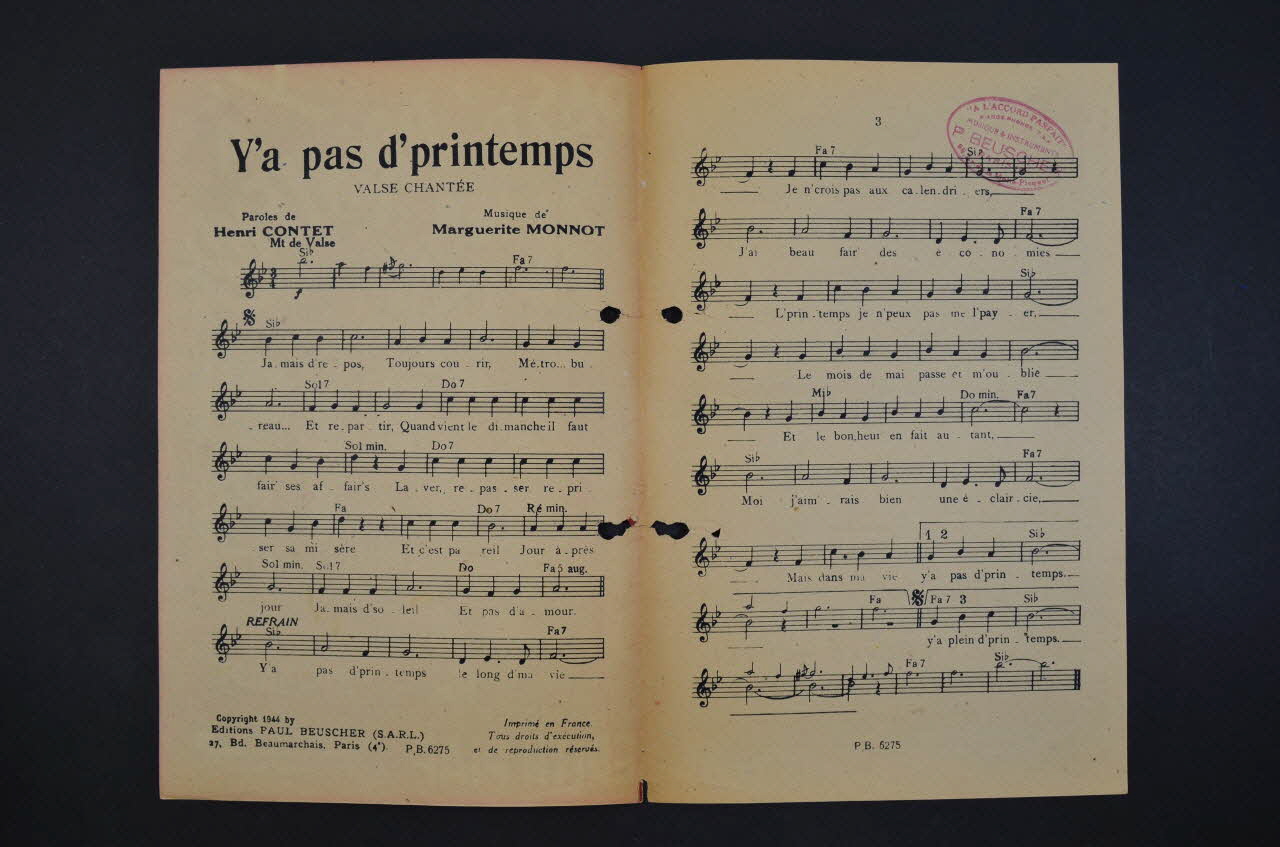 Les inscriptions renseignent le titre de la chanson, le nom des auteurs, de l'artiste et de l'éditeur.