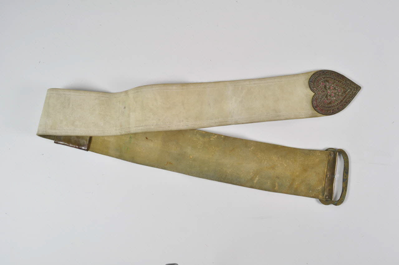 Ceinture en cuir blanc, dont une extrémité est terminée par une plaque de cuivre rivetée, en forme de coeur stylisé, à décors ajourés à l'emporte pièce (petits coeurs, étoiles à cinq branches et losanges) entourés de frises en poinçons.