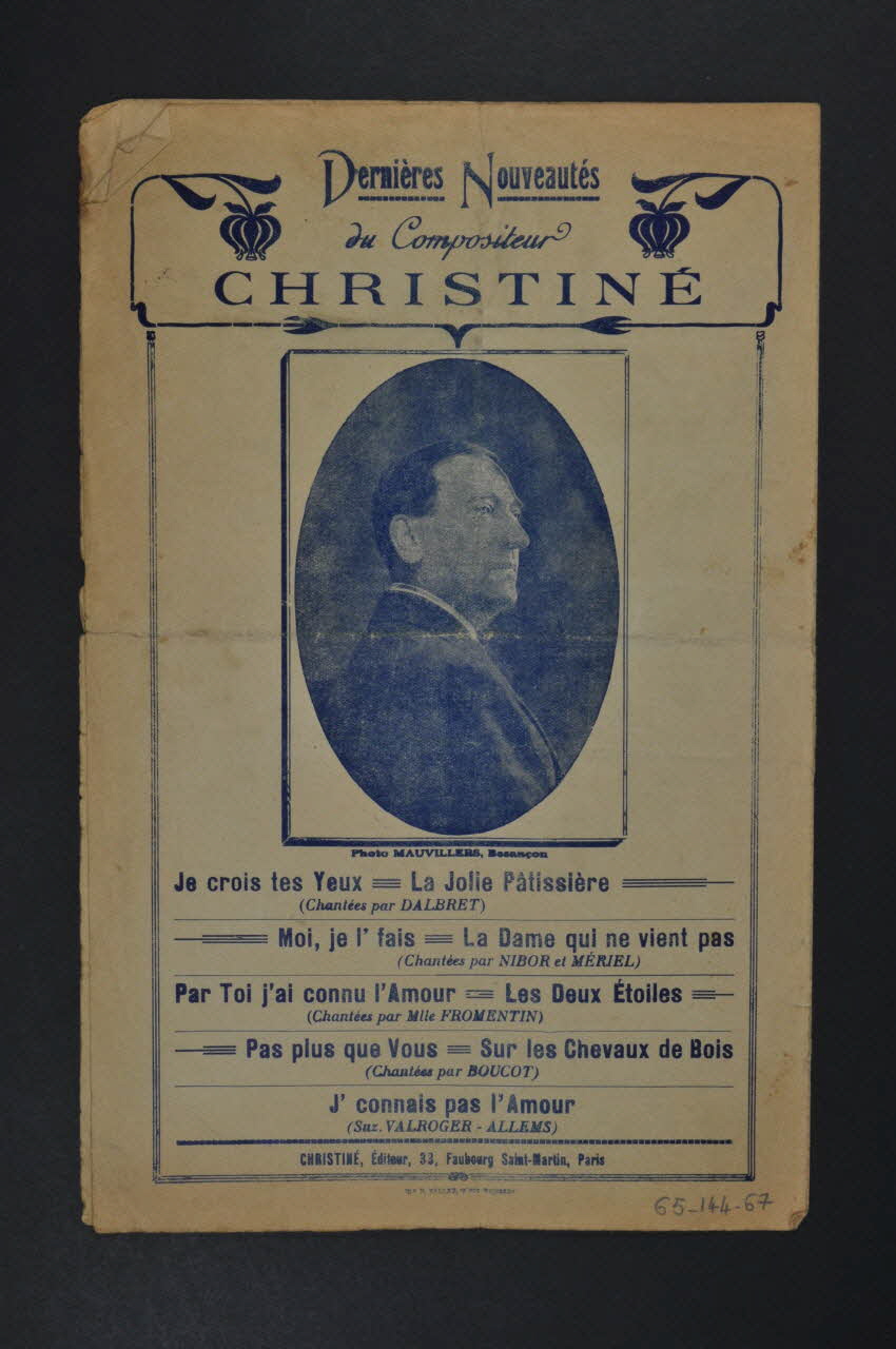 Des inscriptions renseignent le titre, les auteurs, les exécutants et l'éditeur. A l'intérieur, partition et paroles de la chanson. Au dos, liste d'autres partitions publiées par l'éditeur.Décor