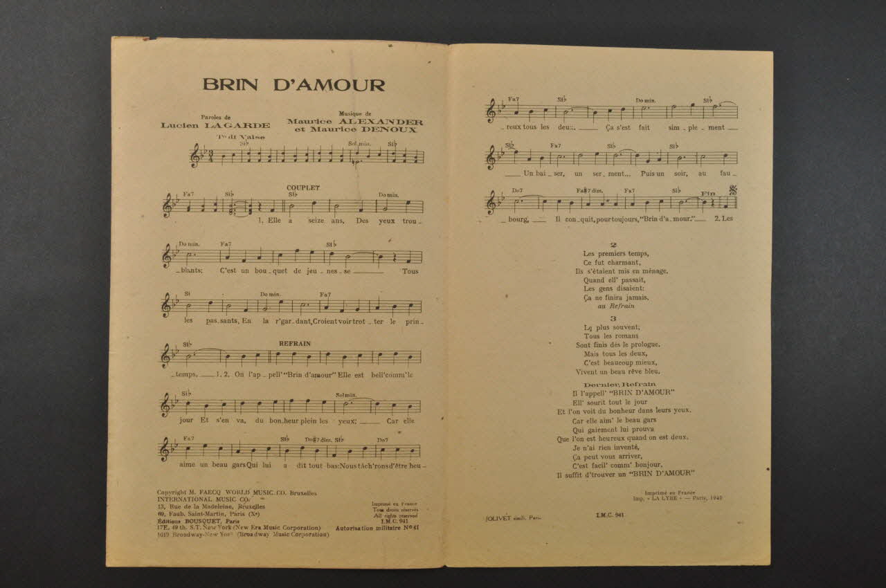 Les inscriptions renseignent le titre de la chanson, le nom des auteurs, de l'artiste et de l'éditeur. A l'intérieur, partitions et paroles de la chanson. Au dos, liste d?autres partitions publiées par l?éditeur.Décor