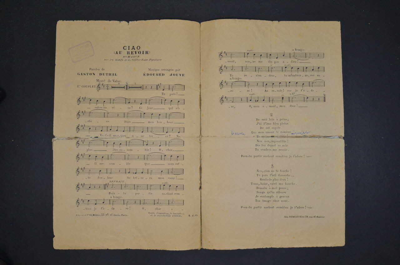 Feuillet rectangulaire en papier industriel, imprimé à l?encre noire. La couverture du feuillet présente des inscriptions renseignant le titre de la chanson, le nom des auteurs, de l'artiste et de l'éditeur.