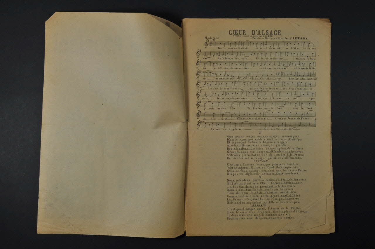 Les inscriptions renseignent le titre de la chanson, le nom des auteurs, de l'artiste et de l'éditeur. A l'intérieur, partitions et paroles de la chanson. Le dos est laissé vierge.Décor