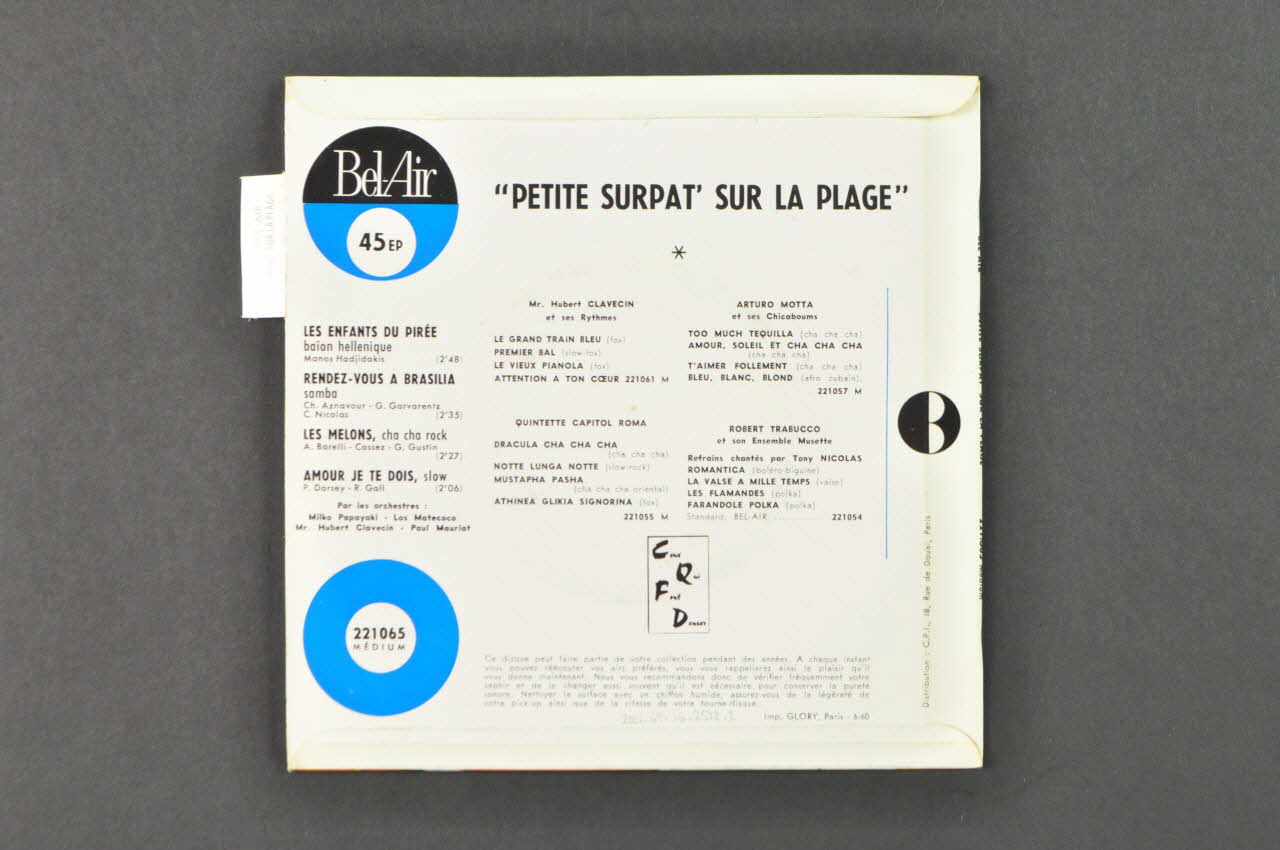De forme carrée, la pochette est en carton, imprimée en couleur, pliée et collée. Les inscriptions sont en français. En haut à droite se trouve une étiquette rectangulaire, saillante. Au recto le fond représente la photo, en couleur, d'une jeune femme, en maillot de bain, allongée. En haut et en bas, se trouvent des inscriptions en jaune, rose et blanc. Au verso le fond est blanc avec des inscriptions en noir.Matériaux et techniques