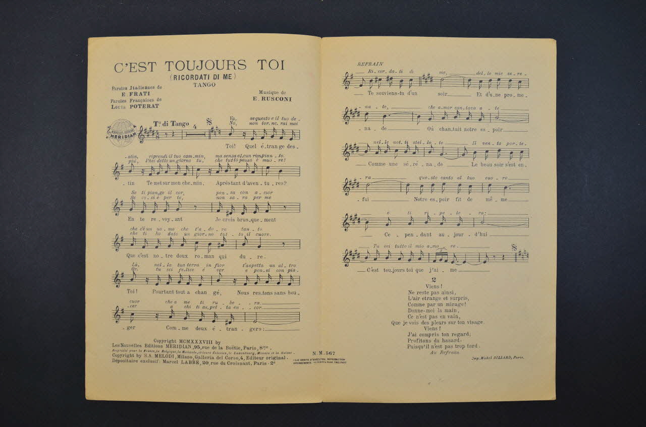 Sur la couverture, le portrait photographique de Tino Rossi. Les inscriptions renseignent le titre de la chanson, le nom des auteurs, de l'artiste et de l'éditeur. A l'intérieur, partition et paroles de la chanson. Au dos, liste d'autres partitions publiées par l'éditeur.Décor