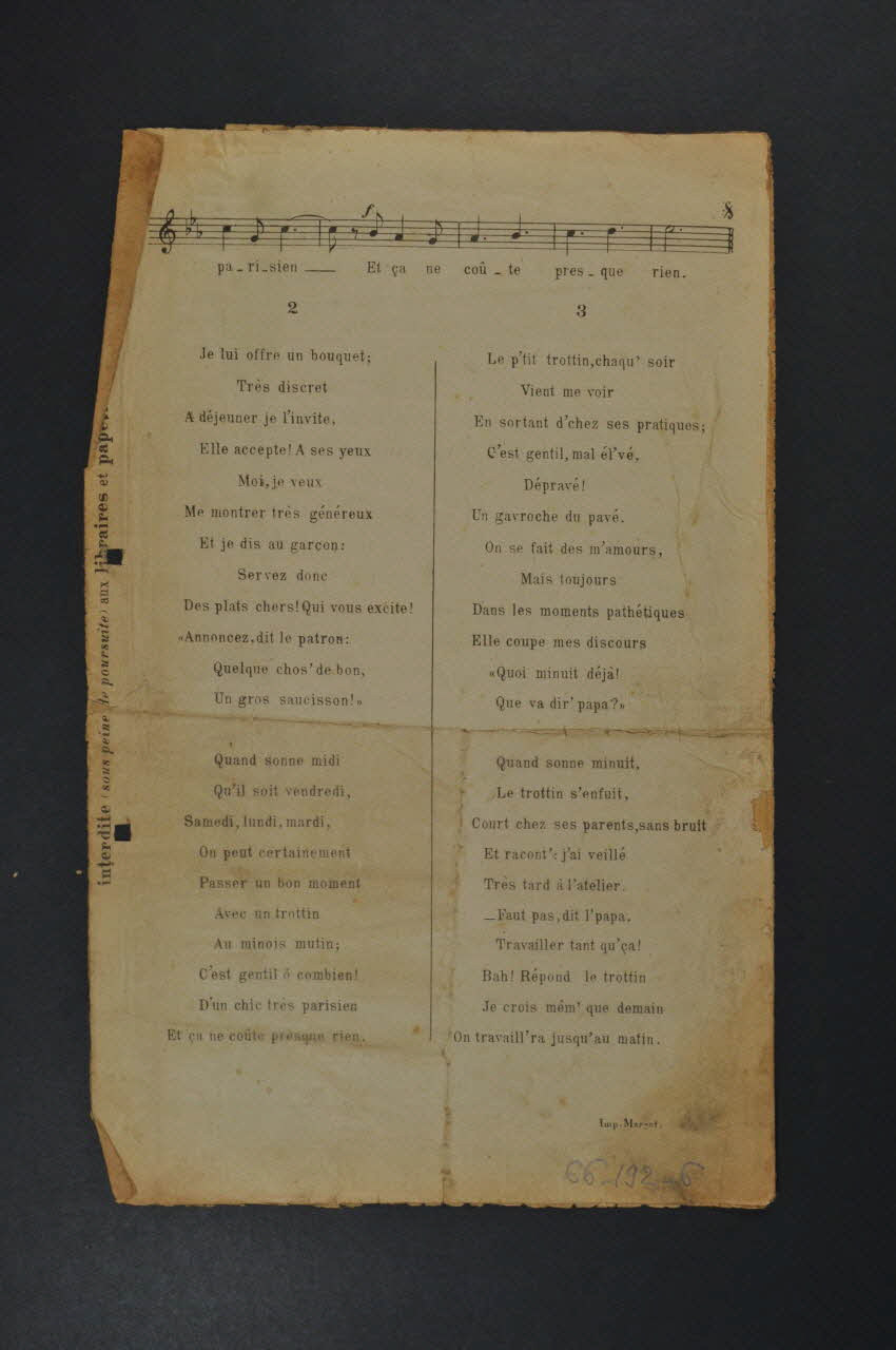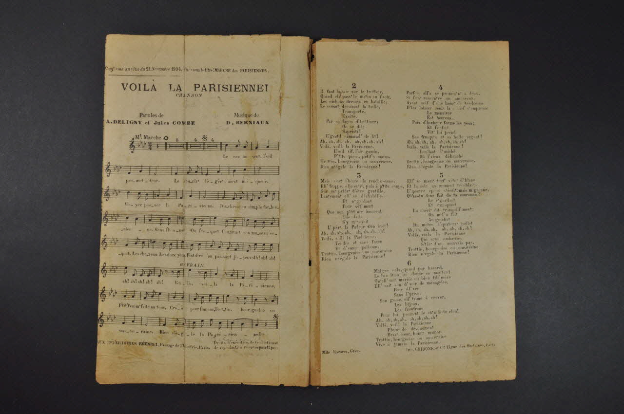 Les inscriptions renseignent le titre de la chanson, le nom des auteurs, de l'artiste et de l'éditeur. A l'intérieur et au dos, partitions et paroles de la chanson.Décor