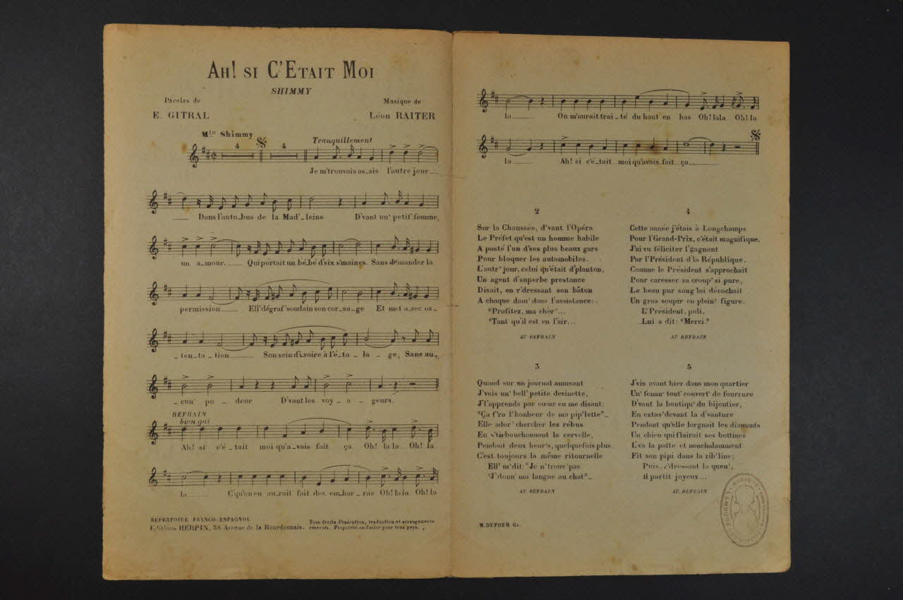 Les inscriptions renseignent le titre de la chanson, le nom des auteurs, de l'artiste et de l'éditeur. A l'intérieur, partitions et paroles de la chanson. Au dos, liste d?autres partitions publiées par l?éditeur.Décor