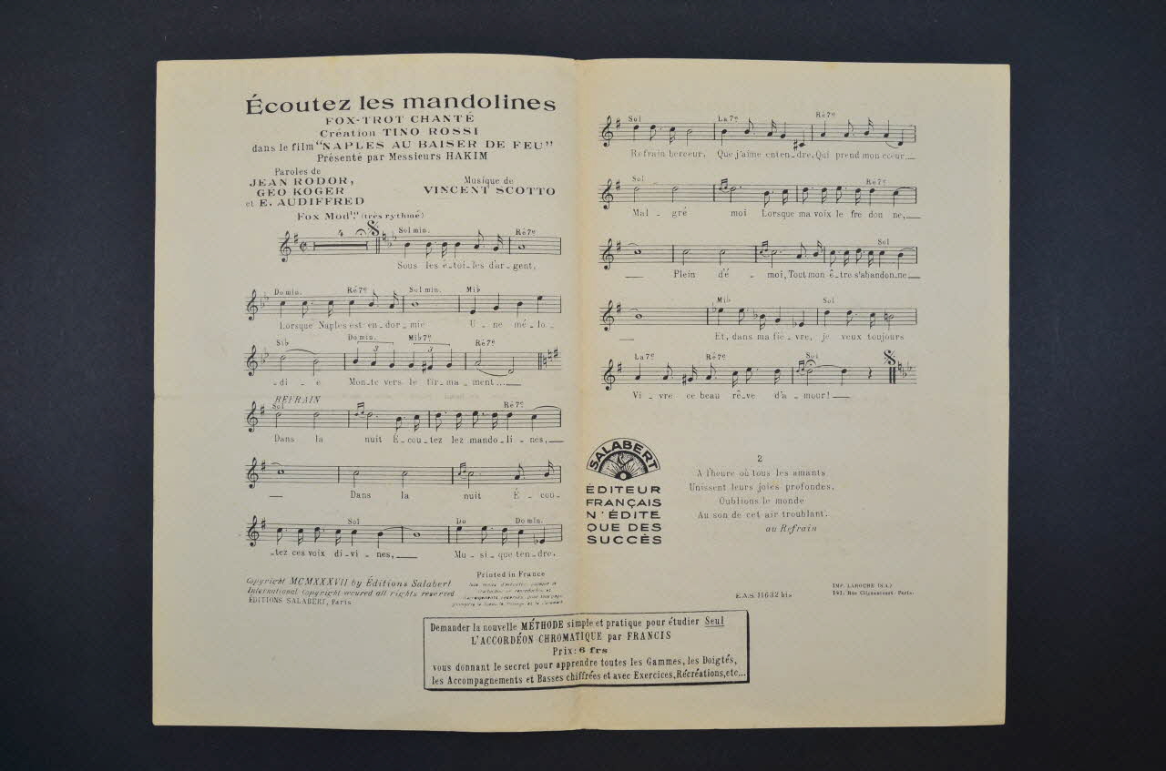 Sur la couverture, le portrait photographique de Tino Rossi jouant de la guitare. Les inscriptions renseignent le titre de la chanson, le nom des auteurs, de l'artiste et de l'éditeur.