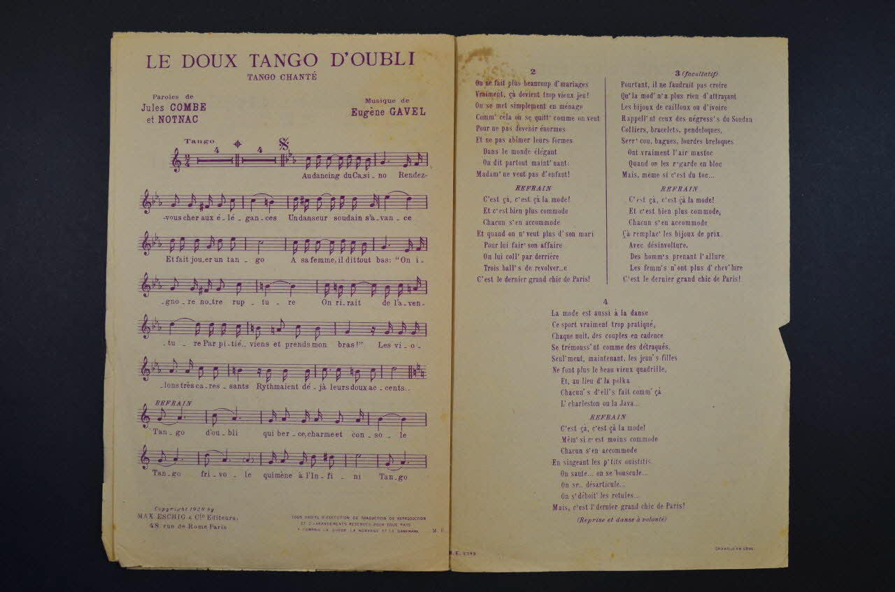 Des inscriptions renseignent les titres, les auteurs, les exécutants et l'éditeur. A l'intérieur, partition et paroles des chansons. Au dos, liste d'autres partitions publiées par l'éditeur.Décor