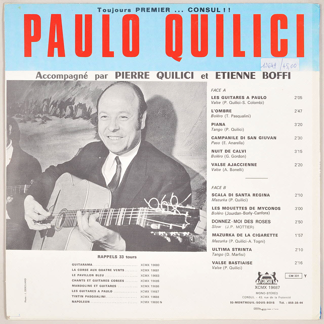 disque 33 tours, Campanile di San Giuvan, Donnez-moi des roses, Les guitares à Paulo, Nuit de Calvi, Scala di Santa Regina, Les guitares à Paulo, Mazurka de la cigarette, Valse bastiaise, Valse ajaccienne, L'ombre, Les mouettes de Myconos, Ultima strinta, Piana