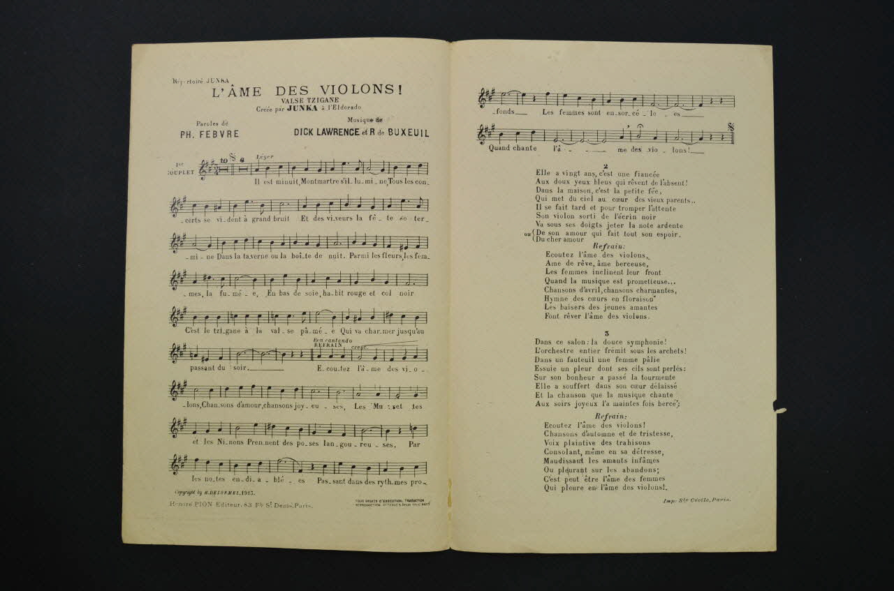 Feuillet rectangulaire en papier industriel, imprimé à l?encre rouge (sauf l?intérieur à l?encre noire). La couverture du feuillet présente le dessin d'une violoniste.