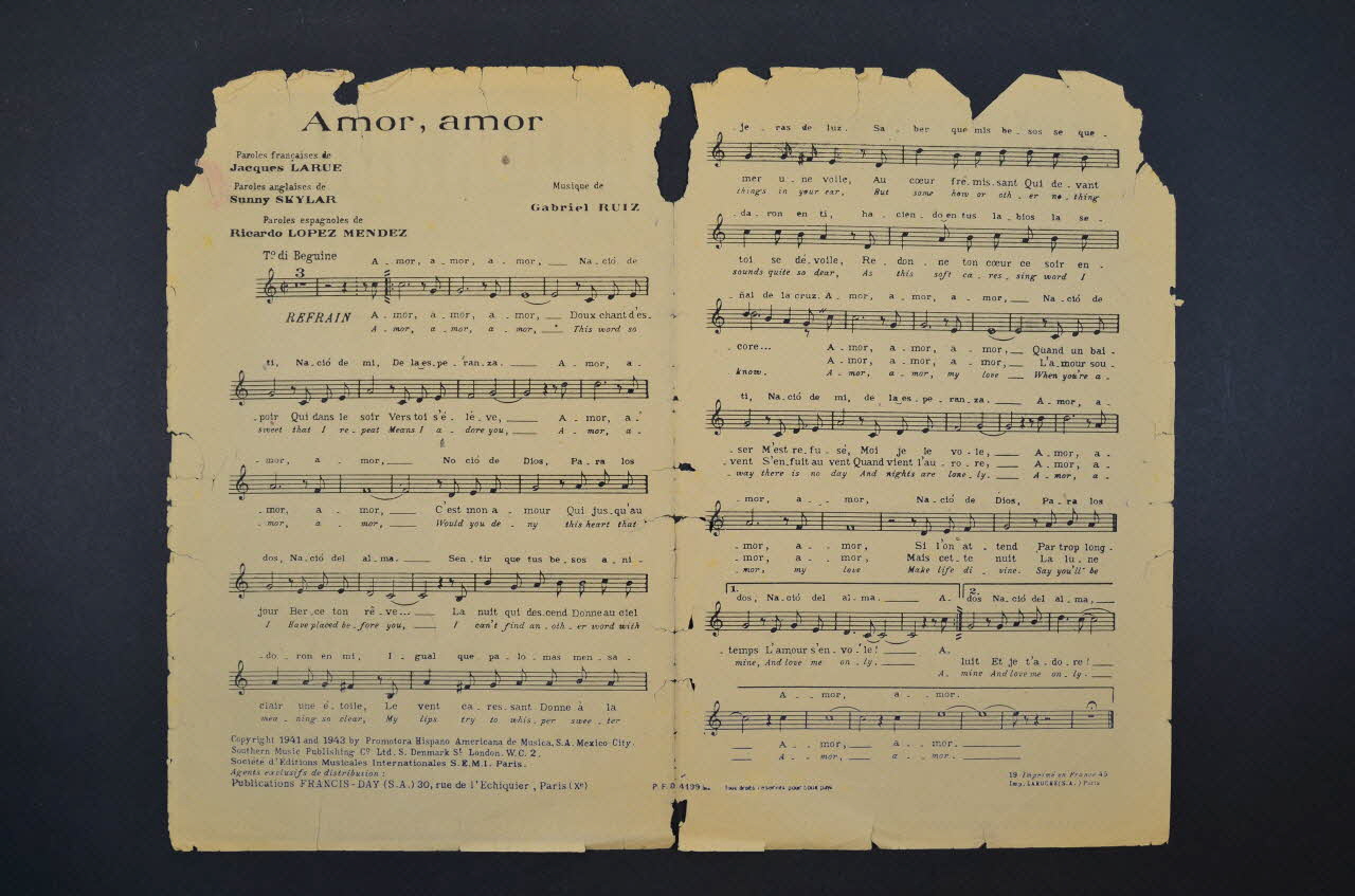 Sur la couverture, les portraits photographiques de Tino Rossi, en haut à droite, et de Victoria Marino, en bas à gauche ; dans la partie supérieure, représentation d'un Cupidon avec arc et carquois s'apprêtant à décocher une flèche, le genoux posé sur une chaise, et triple représentation d'un couple enlacé sous un arbre avec étoiles dans le champ. Les inscriptions renseignent le titre de la chanson, le nom des auteurs, des artistes et de l'éditeur. A l'intérieur, partition et paroles de la chanson. Au dos, liste d'autres partitions publiées par l'éditeur.Décor