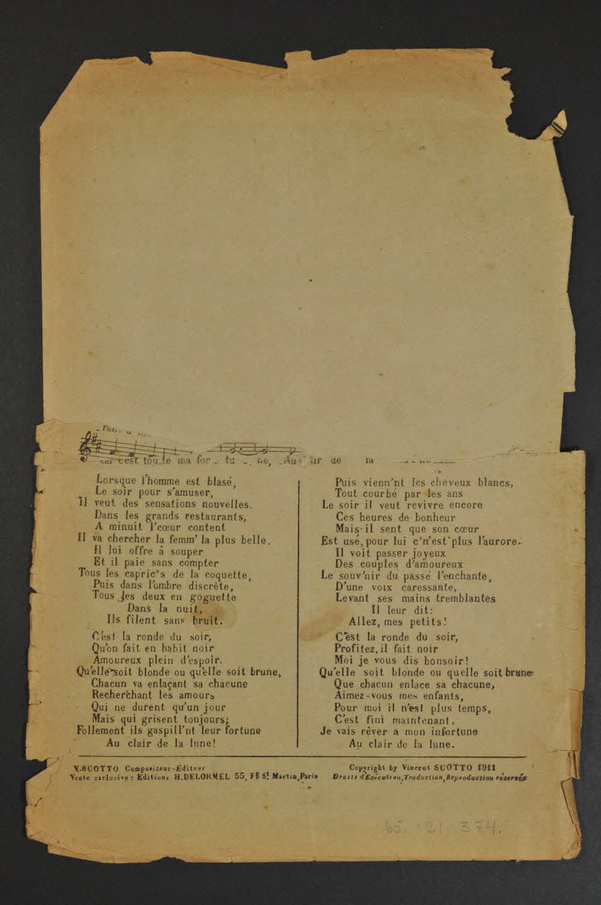 Des inscriptions renseignent le titre, les auteurs, les exécutants et l'éditeur. L'intérieur est laissé vierge. Au dos, les paroles et la partition.Matériaux et techniques