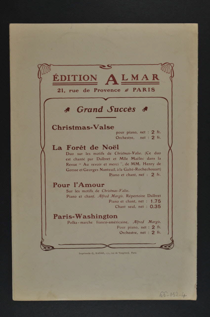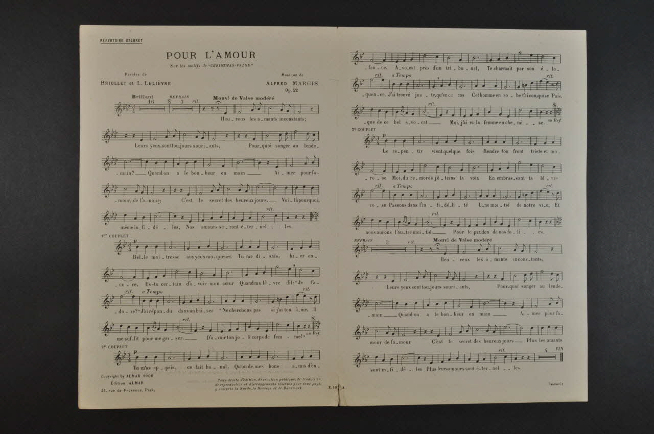 Les inscriptions renseignent le titre de la chanson, le nom des auteurs, de l'artiste et de l'éditeur. A l'intérieur, partitions et paroles de la chanson. Au dos, liste d?autres partitions publiées par l?éditeur.Décor