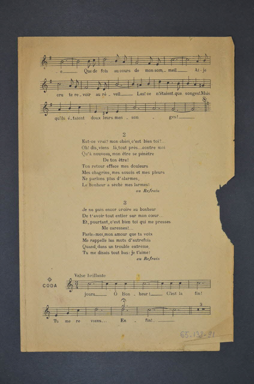 Au recto et au verso, partition et paroles de la chanson. Les inscriptions qui renseignent le titre de la chanson, le nom des auteurs, des artistes et de l'éditeur.Matériaux et techniques