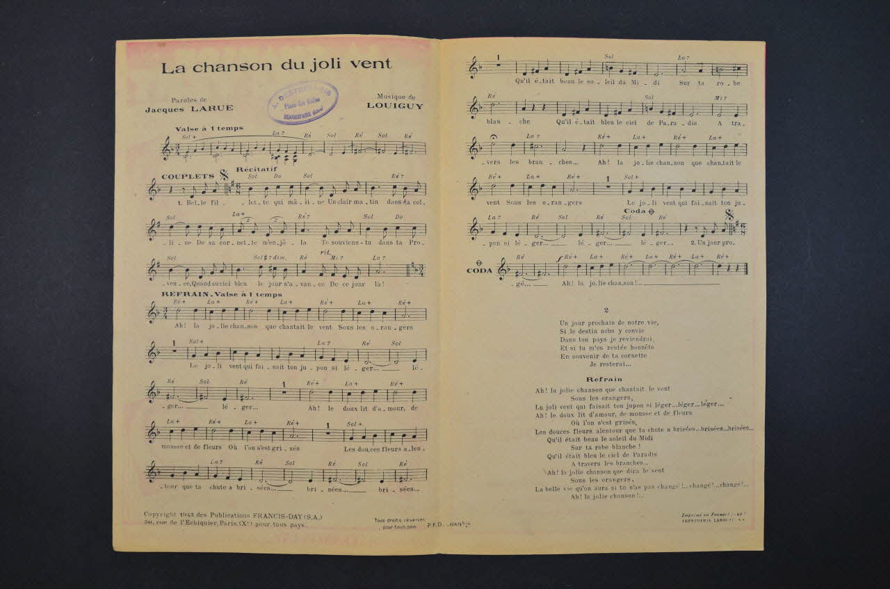 chanson, partition de musique, petit format, La chanson du joli vent