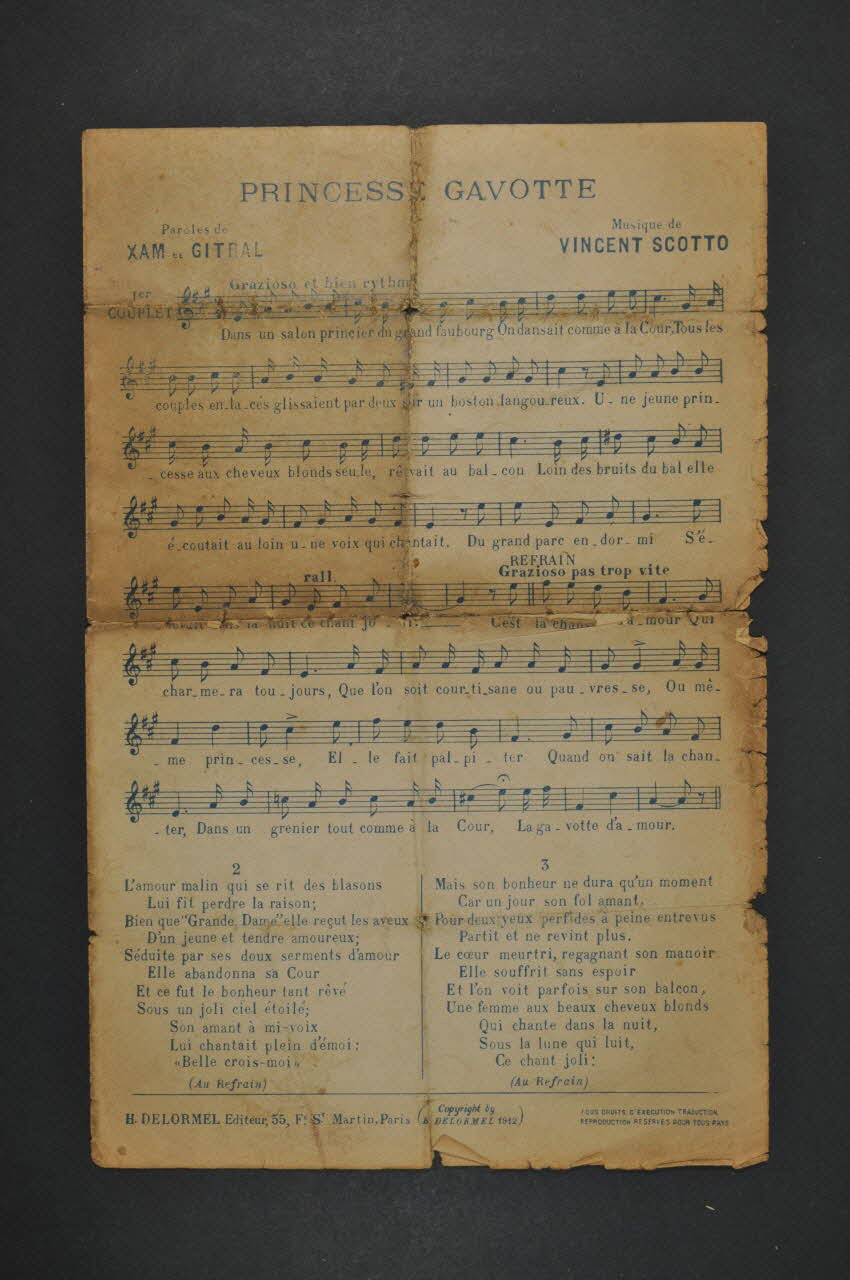 Des inscriptions renseignent le titre, les auteurs, les exécutants et l'éditeur. A l'intérieur, partition et paroles de la chanson. Au dos, liste d'autres partitions publiées par l'éditeur.Décor
