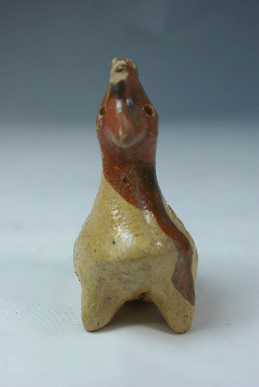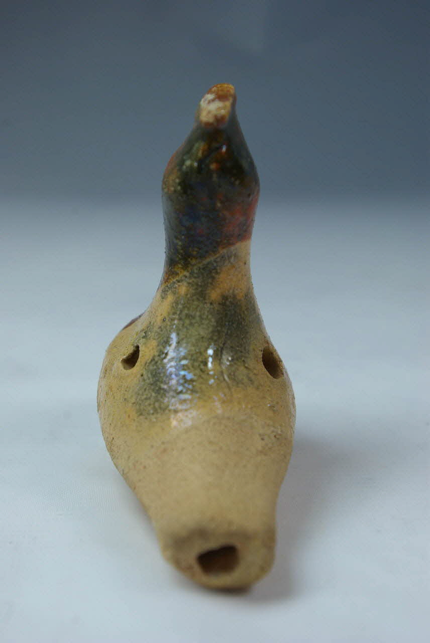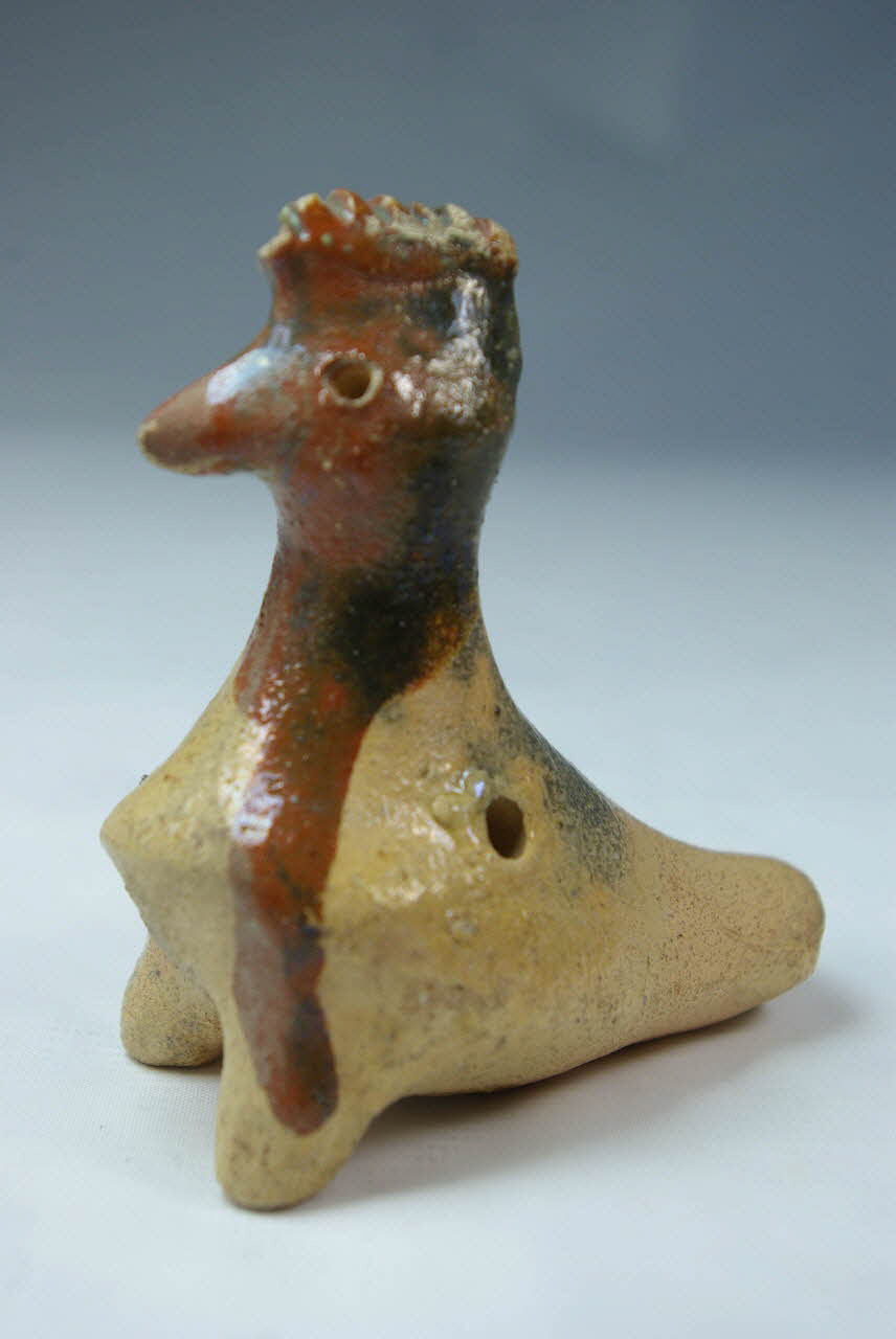 terre cuite modelée, incision, rapporté/ émaillé glaçuré transparent / Représente un oiseau à crête (poule?) dont le corps creux de forme ovoïde allongée forme le résonateur de la flûte. Le canal d'insufflation est percé à l'arrière du corps et communique avec la fenêtre en forme de long rectangle découpée sous le corps, au milieu. Les trous de jeu sont percés au milieu des flancs de l'oiseau, un de chaque coté. A l'avant du corps de l'oiseau, deux courtes "pattes" permettent de poser l'objet. Des traits sont incisés en haut de la crête et des points figurent les yeux. La figurine est modelée en terre claire couverte d'un engobe marron, sur la tête et le cou, ayant coulé vers le bas (coté gauche). Une glaçure transparente recouvre le volatile sauf le dessous et l'arrière du corps. Cette glaçure présente une zone grisâtre à l'arrière de la tête et sur le dos.