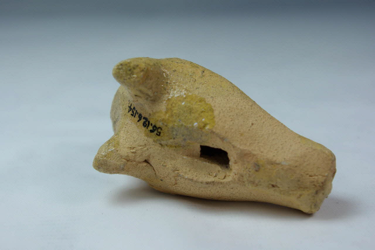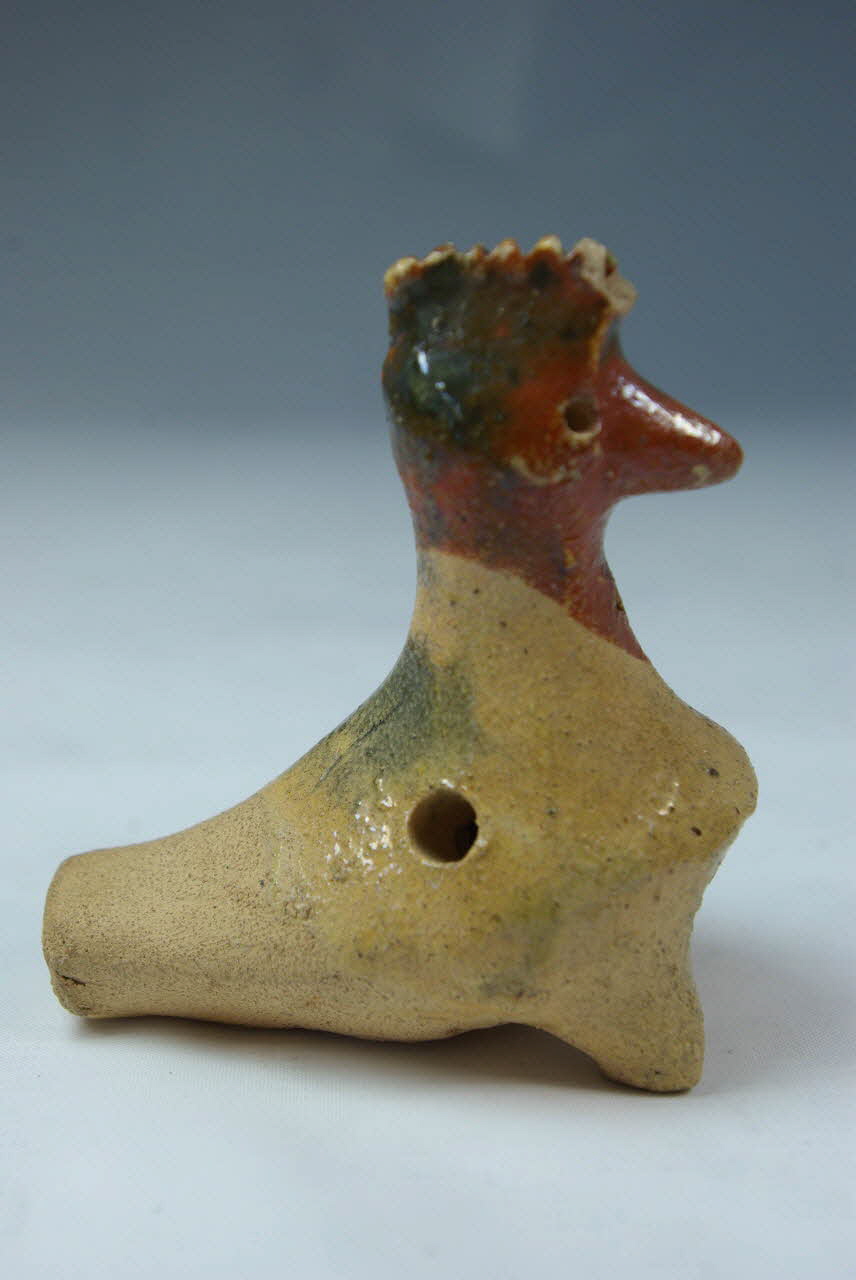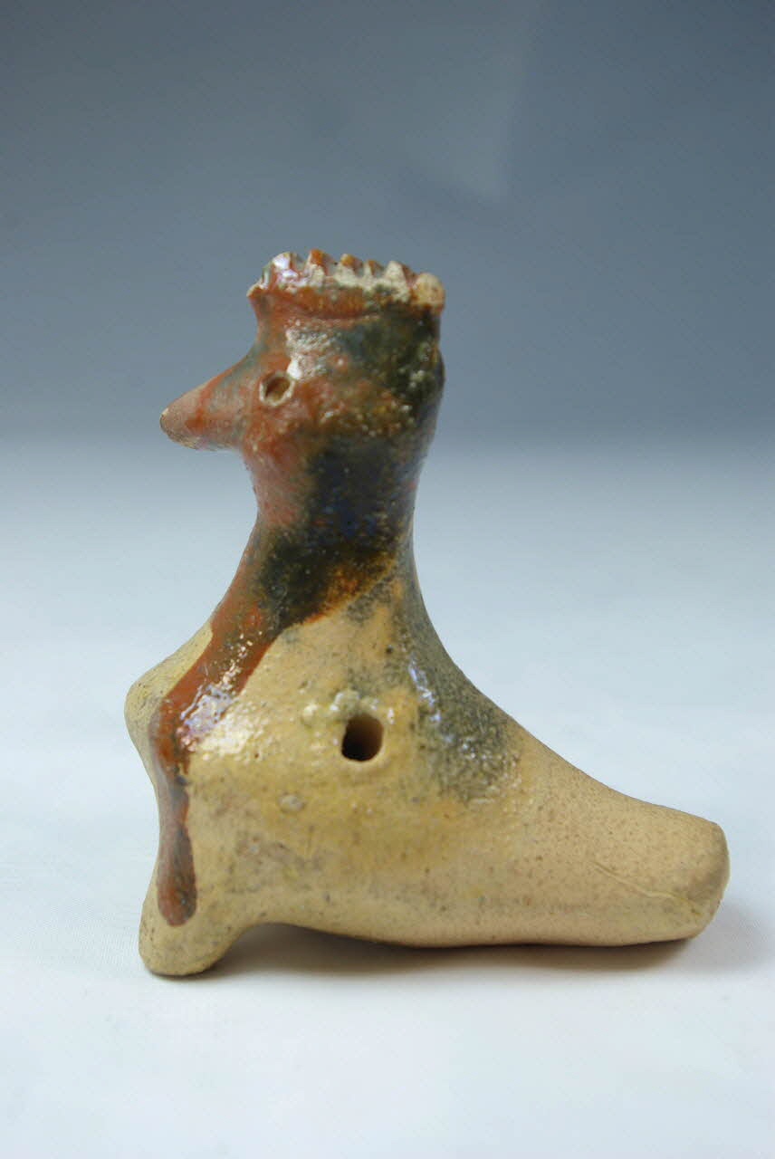 terre cuite modelée, incision, rapporté/ émaillé glaçuré transparent / Représente un oiseau à crête (poule?) dont le corps creux de forme ovoïde allongée forme le résonateur de la flûte. Le canal d'insufflation est percé à l'arrière du corps et communique avec la fenêtre en forme de long rectangle découpée sous le corps, au milieu. Les trous de jeu sont percés au milieu des flancs de l'oiseau, un de chaque coté. A l'avant du corps de l'oiseau, deux courtes "pattes" permettent de poser l'objet. Des traits sont incisés en haut de la crête et des points figurent les yeux. La figurine est modelée en terre claire couverte d'un engobe marron, sur la tête et le cou, ayant coulé vers le bas (coté gauche). Une glaçure transparente recouvre le volatile sauf le dessous et l'arrière du corps. Cette glaçure présente une zone grisâtre à l'arrière de la tête et sur le dos.
