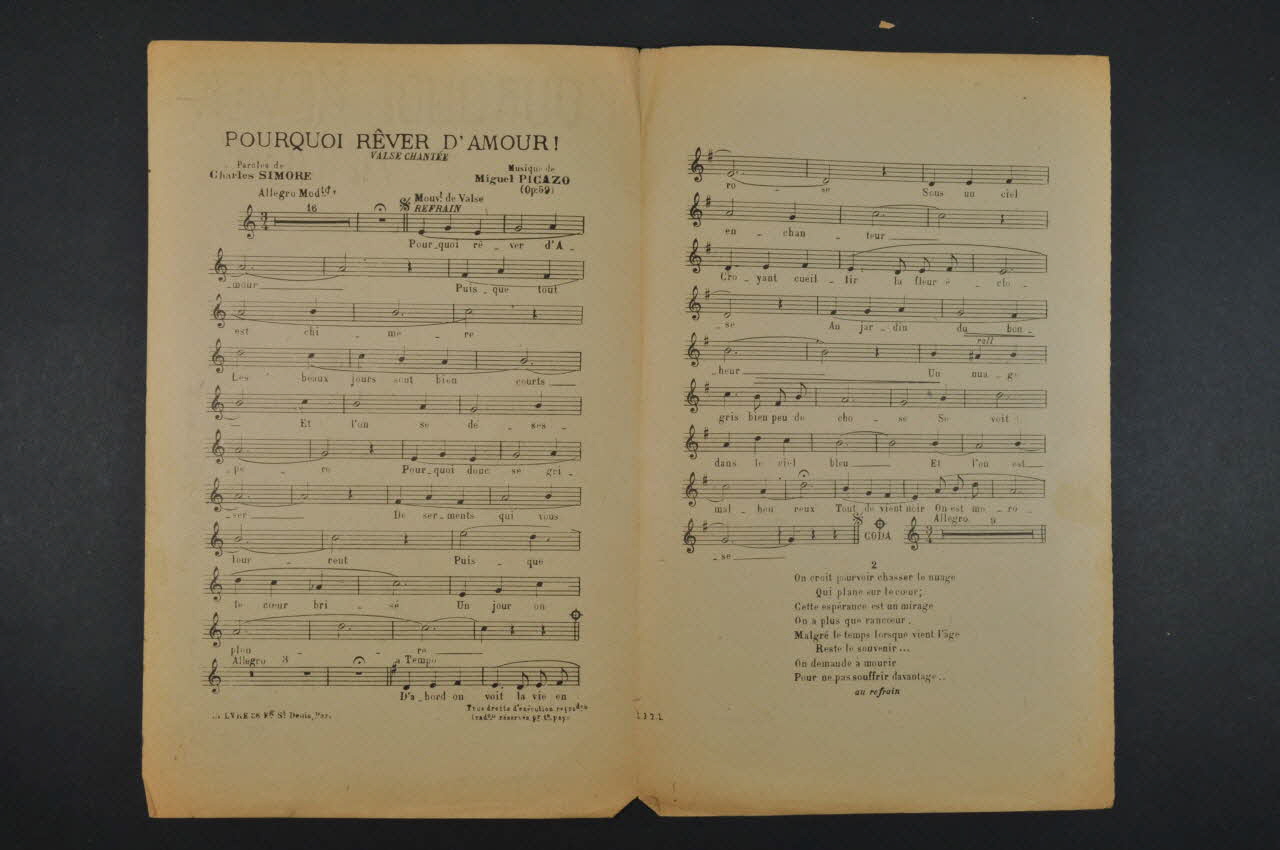 Les inscriptions renseignent le titre de la chanson, le nom des auteurs, de l'artiste et de l'éditeur. A l'intérieur, partitions et paroles de la chanson. Le dos est laissé vierge.Matériaux et techniques