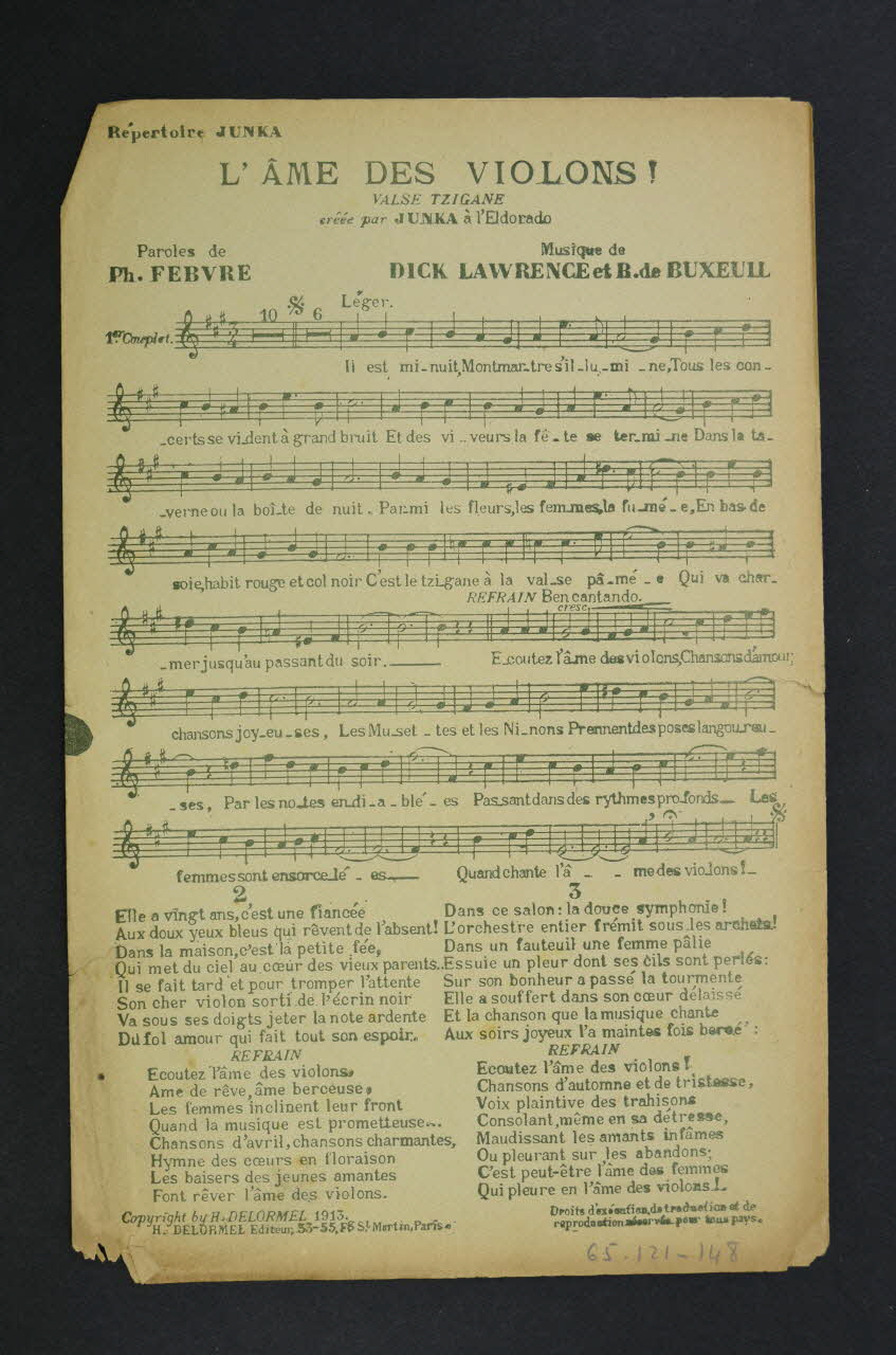 Les inscriptions renseignent le titre de la chanson, le nom des auteurs, de l'artiste et de l'éditeur. L'intérieur est laissé vierge. Au dos, la partition et les paroles.Matériaux et techniques