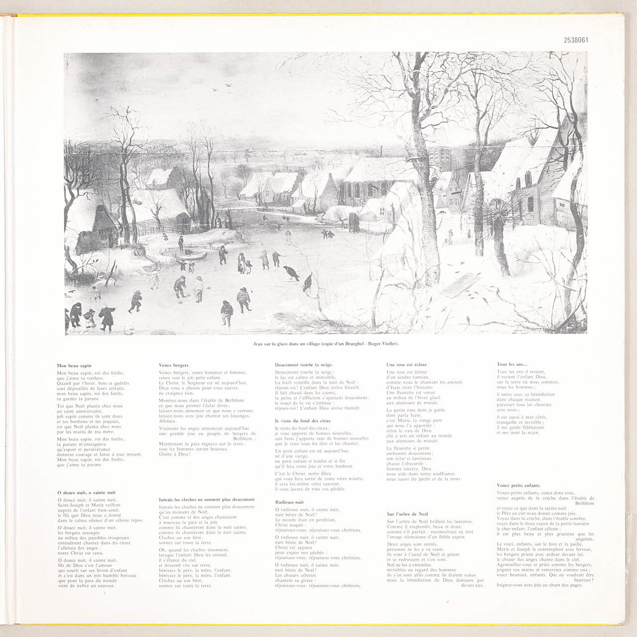 Le verso présente sur un fond blanc la liste des titres de l'album au dessus d'une photographie couleur de deux enfants derrière un sapin de Noël. La pochette s'ouvre dans le sens latéral. A l'intérieur sont visibles les paroles et leur traduction des chansons, une photographie noir et blanc d'un groupe d'enfants sur la place d'un village à Noël ainsi qu'une reproduction noir et blanc d'un tableau de Brueghel représentant un village sous la neige à côté d'un plan d'eau gelé. L'étiquette au centre du disque présente un fond gris sur lequel sont inscrits les titres et le logo de l'éditeur.Inscriptions