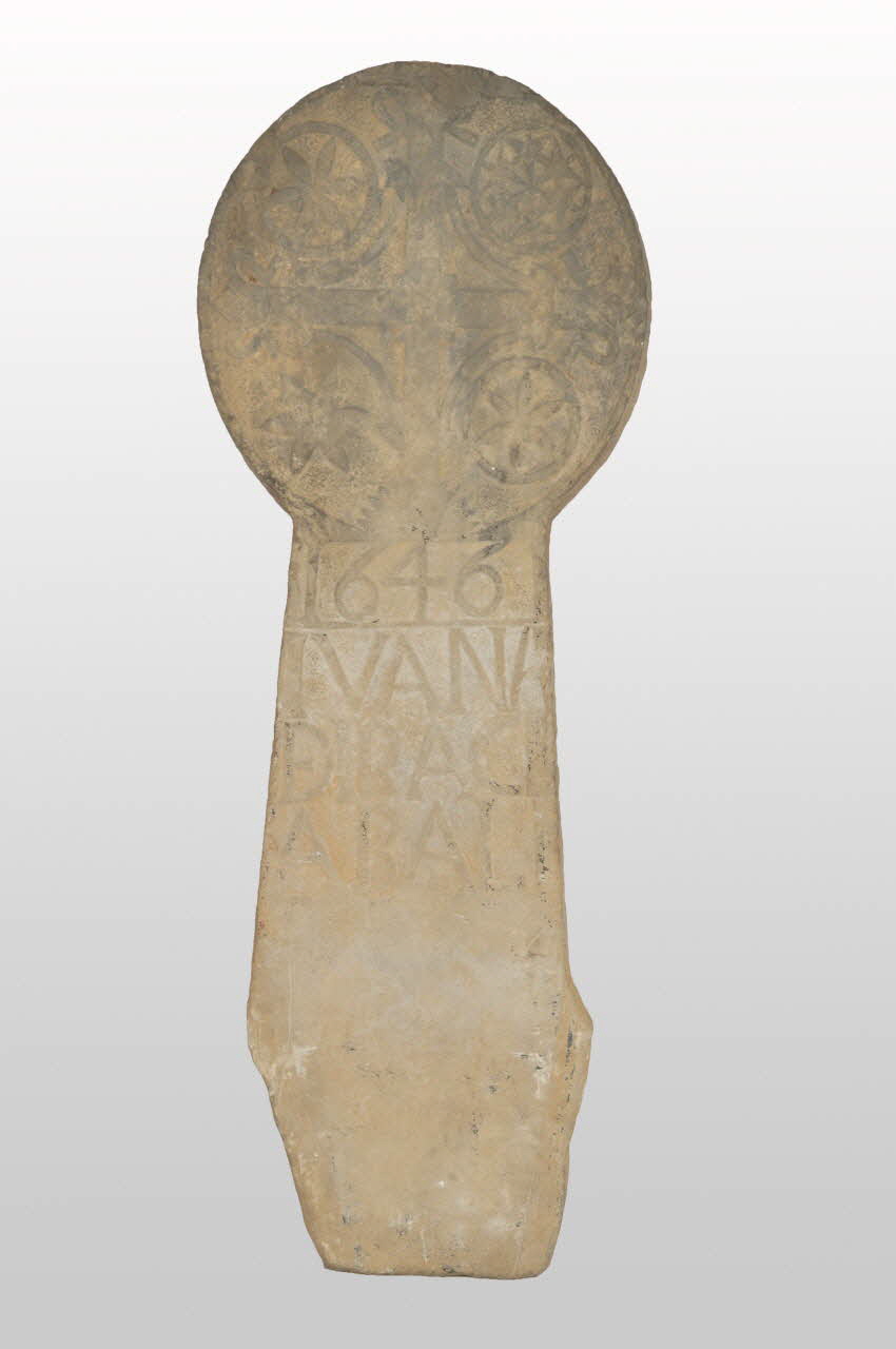 En pierre taillée, de forme rectangulaire en partie centrale, prolongée par une forme discoïdale en partie supérieure et trapézoïdale en partie inférieure. Sur une face, sur la partie discoïdale sont sculptés des cercles concentriques, occupés en partie centrale par une étoile de David, au centre de laquelle est sculptée une rosace. De petits chevrons triangulaires parsèment le reste du cercle. Des motifs de pointes sont placés sur les rebords des cercles, sur le dessus et le dessous et sur les côtés gauche et droit. Au centre, un motif circulaire est occupé par un petit cercle central d'où partent des motifs étoilés. Dessous, un motif d'oiseau stylisé à longue queue est sculpté dans la pierre. Sur l'autre face, la partie discoïdale est décorée, en partie centrale d'une croix carrée terminée par des volutes et reprenant des formes d'orfèvrerie. Les quatre coins sont occupés par des rosaces, dans le coin supérieur gauche et dans le coin inférieur droit, dans le coin supérieur droit, d'un cercle occupé par un motif de flocon et dans le coin inférieur gauche, d'un cercle occupé par une étoile. Une inscription occupe la partie rectangulaire centrale.