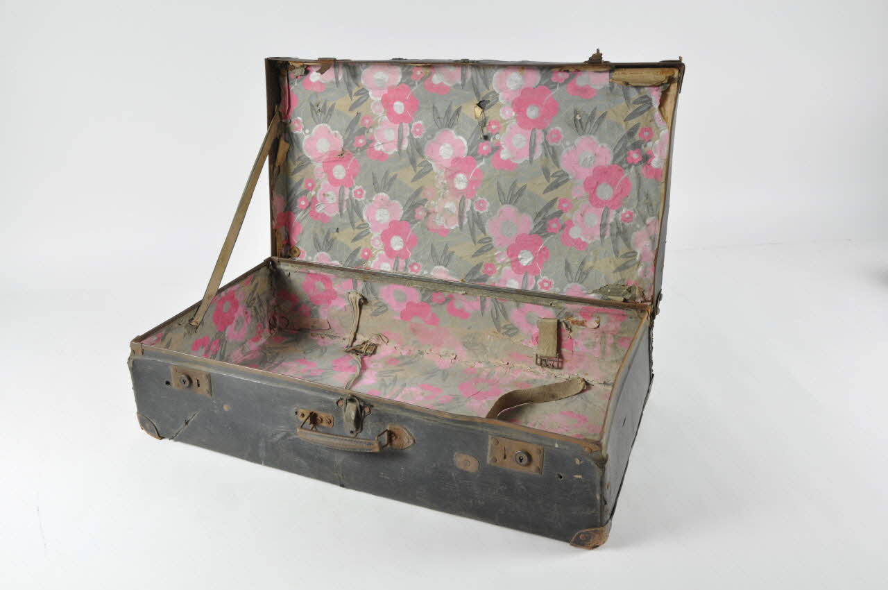 De forme parallélépipédique en carton bouilli peint en noir. Des renforts de carton ou de métal sont cloués sur les coins. Le couvercle s'ouvre grâce à deux charnières et se ferme avec trois verrous sur le devant. Une poignées sur le devant. L'intérieur est tapissé de papier-peint à fleurs roses sur un fond vert.