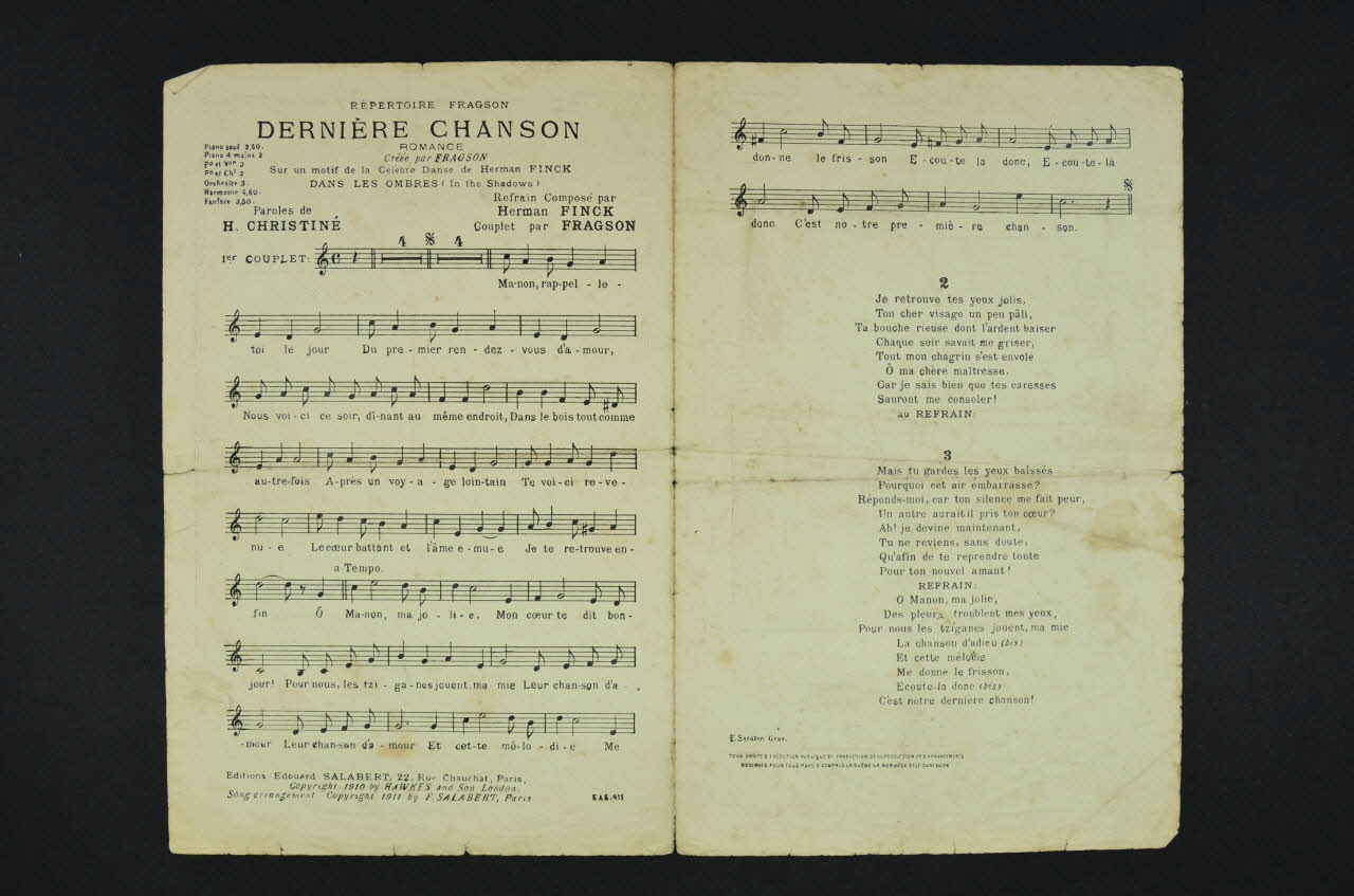 Feuillet rectangulaire en papier industriel imprimé à l'encre brune (sauf à l'intérieur, encre noire). Sur la couverture, un portrait photographique de Fragson au piano.