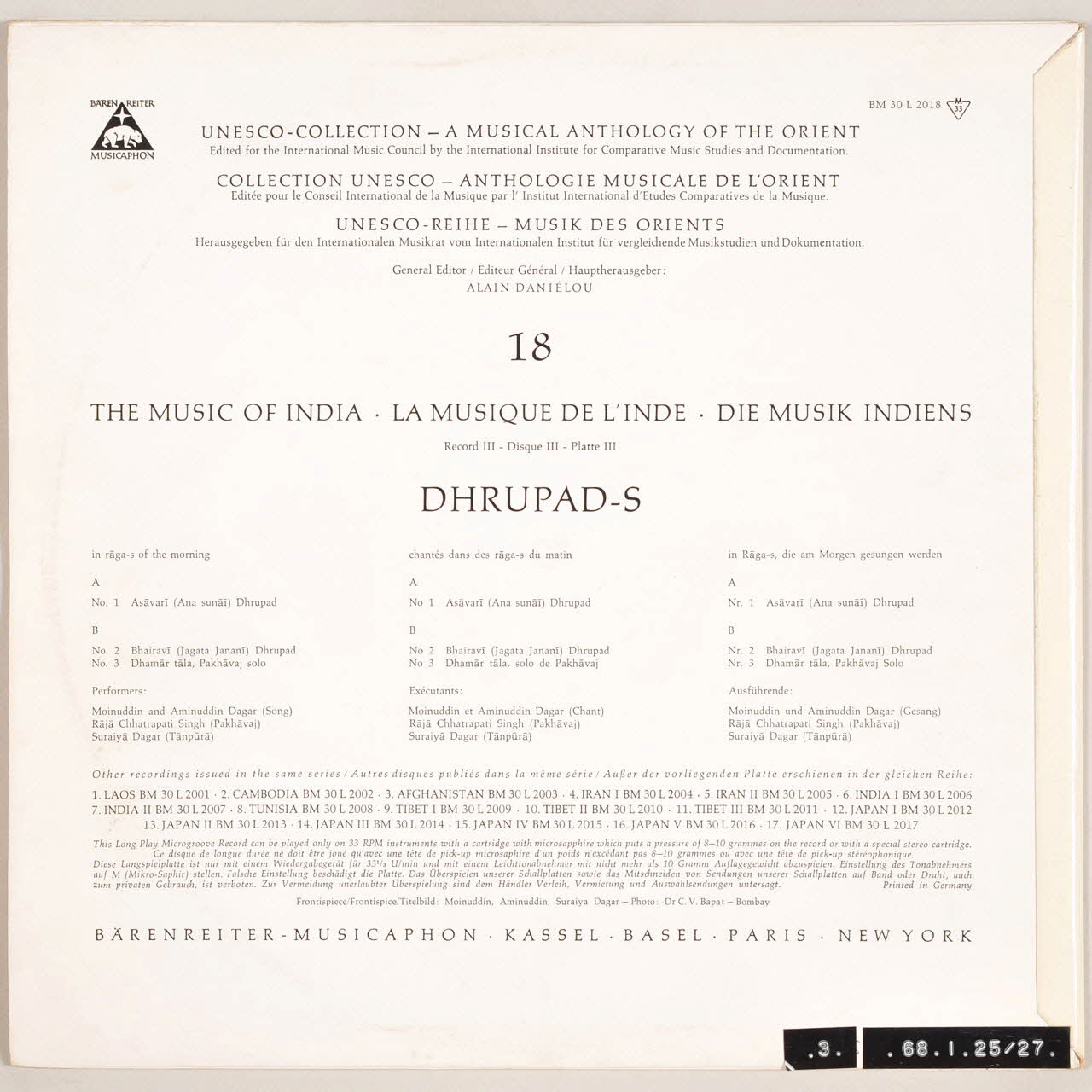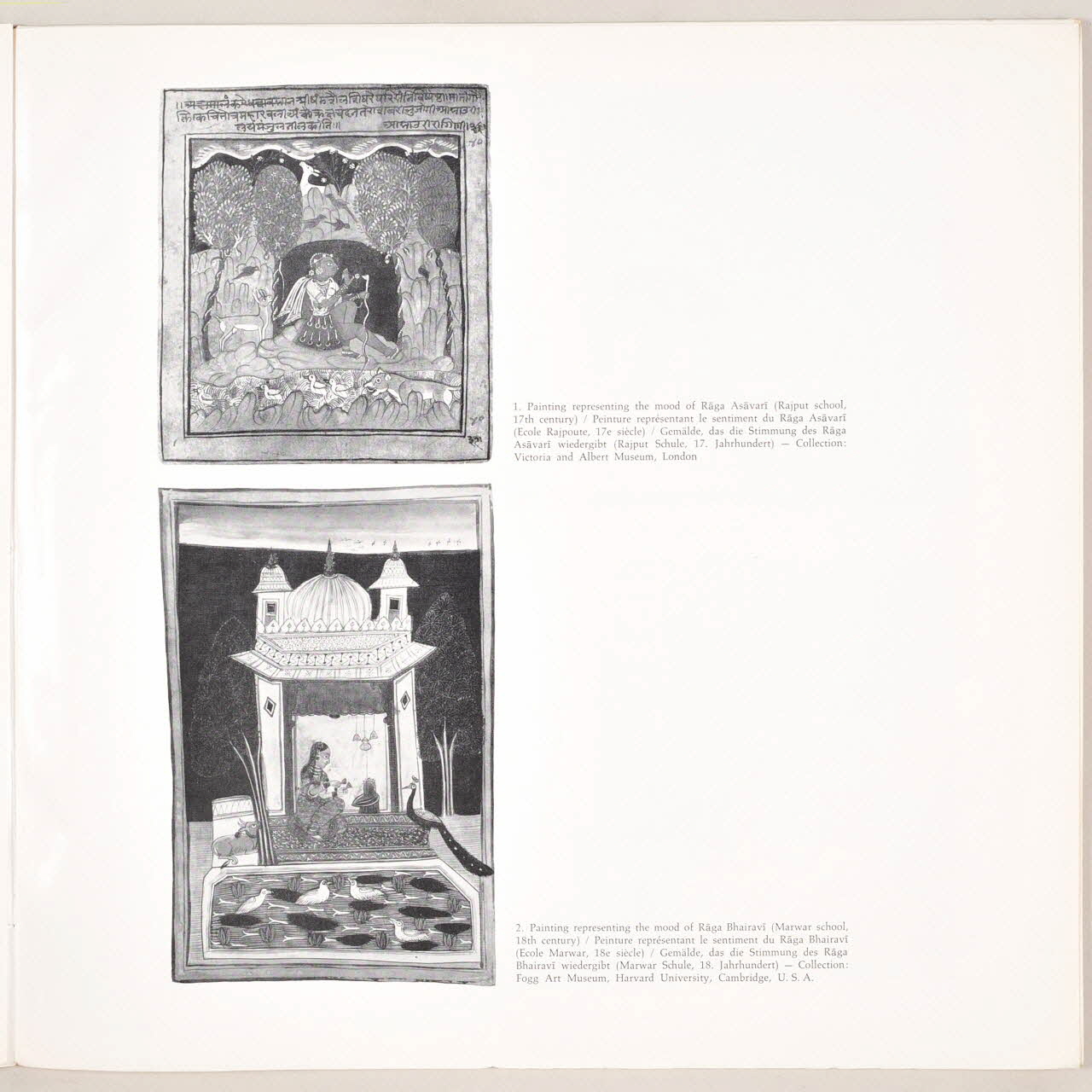 La pochette s'ouvre en livret, avec explications et photographies sur la musique indienne, en anglais, français et allemand. Au dos, présentation des titres et informations sur l'album. Au centre du disque, sur les deux faces, une étiquette circulaire en papier imprimé de couleur rouge et blanche avec une écriture noire renseignant les titres, auteurs, exécutants et éditeur.Décor