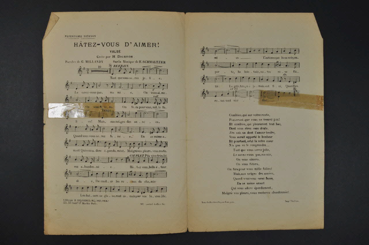Des inscriptions renseignent le titre, les auteurs, les exécutants et l'éditeur. A l'intérieur, partition et paroles de la chanson. Au dos, liste d'autres partitions publiées par l'éditeur.Décor