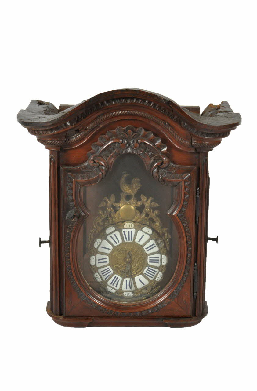 Cadran d'horloge (.3) constitué d'une plaque de cuivre ajourée et finement gravée, représentant en partie supérieure au coq encadré de deux oiseaux sur des guirlandes végétales encadrant un médaillon lisse. En partie inférieure, des guirlandes végétales et une coquille encadrent une plaque en émail peint. Au centre le cadran proprement dit comporte vingt-quatre plaques en émail peint, douze disposés sur un premier registre concentrique avec des chiffres romains et douze plus petites sur le registre concentrique extérieur avec les chiffres arabes.