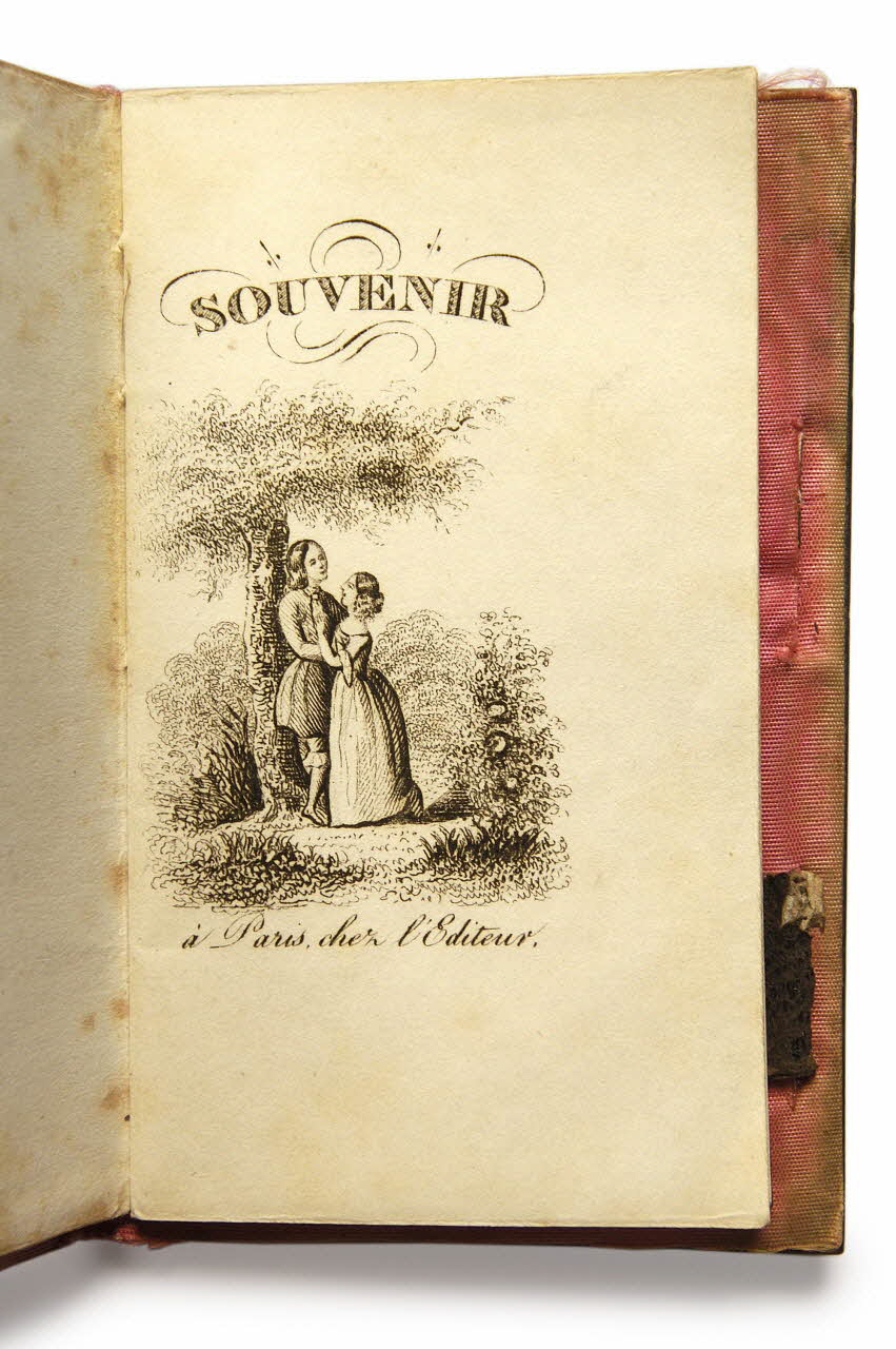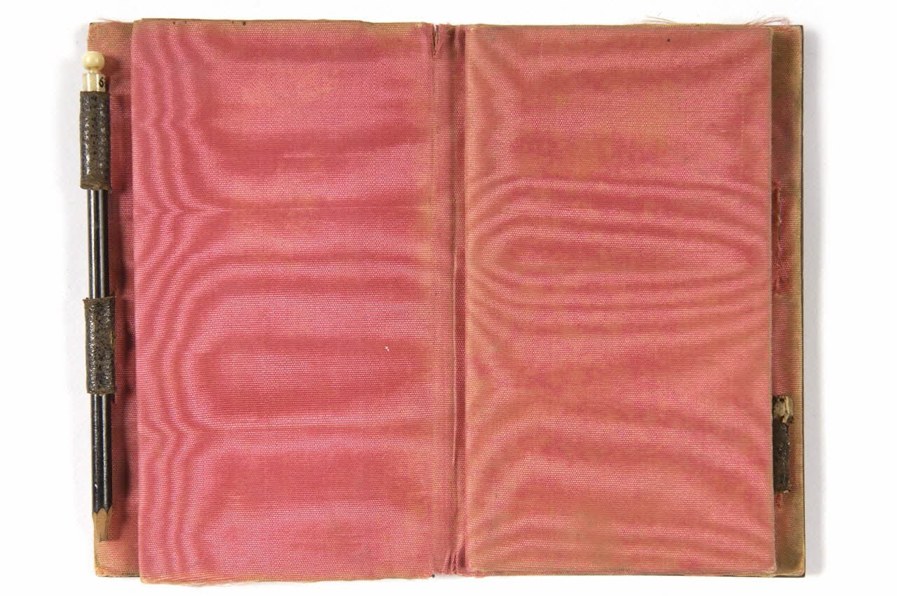 carnet - 1ère page inscription - couple prés d'un arbre - 20 pages (au milieu : pages avec jour de la semaine) - couverture en soie rouge crayon : extrémité en os blancInscriptions