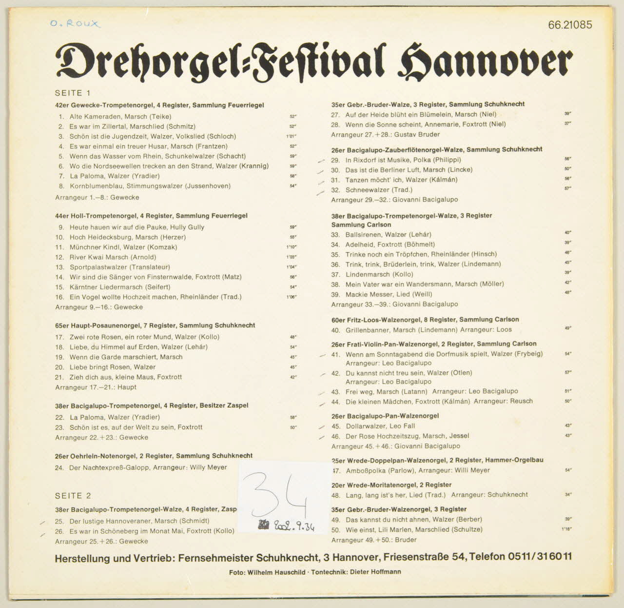 disque 33 tours, Schneewalzer, Ballsirenen, Liebe bringt Rosen, Wenn das Wasser vom Rhein, Er war in Schnöneberg im Monat Mai, Drehorgel-Festival Hannover, Kärntner Liedermarsch, Ein Vogel wolite Hochzeit machen, Das ist die Berliner Luft, Wir sind die Sänger von Finsternwalde, Die kleinen Mädchen, Der lustige Hannoveraner, Auf der Heide blüht ein Blümelein, Wenn die Sonne scheint, Annemarie, Grillenbanner, River Kwai Marsch, Liebe, du Himmel auf Erden, Das kannst du nicht ahnen, Der Nachtexpreb-galopp, Kornblumenblau, Tanzen möcht' ich, Trinke noch ein Tröpfchen, Rheinländer, Heute hauen wir auf die Pauke, Lang, lang ist's her, Zieh dich aus, kleine Maus, Du kannst nicht treu sein, Der Rose Hochzeitszug, Schön ist es, auf der Welt zu sein, Münchner Kindl, In Rixdorf ist Musike, Er war einmal ein treuer Husar, Wie einst, Lili Marlen, Mackie Messer, Lied, Alte Kameraden Marsch, Trink, trinl, Brüederlein, trink, Wenn die Garde marschiert, La Paloma, Hoch Heidecksburg, Wenn am Sonntagabend die Dorfmusik spielt, Sportpalastwalzer, Ambobpolka, Wo die Nordseewellen trecken an den Strand, Mein vater war ein Wandersmann, Es war im Zillertal, Adelheid, Lindenmarsch, Dollarwalzer, Zwei rote Rosen, ein roter Mund, Frei weg, Schön ist die Jugendzeit