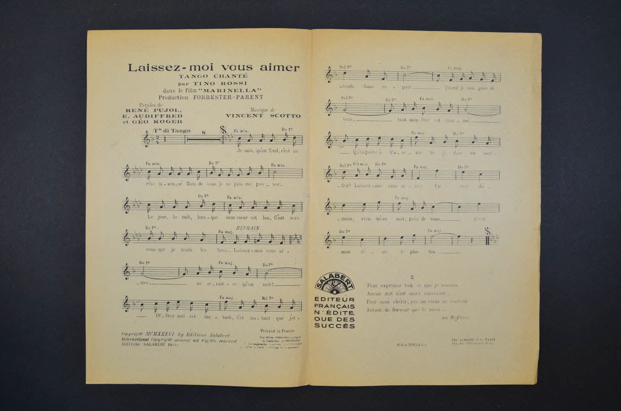 Au dos, le portrait photographique de Tino Rossi et liste d'autres partitions publiées par l'éditeur.