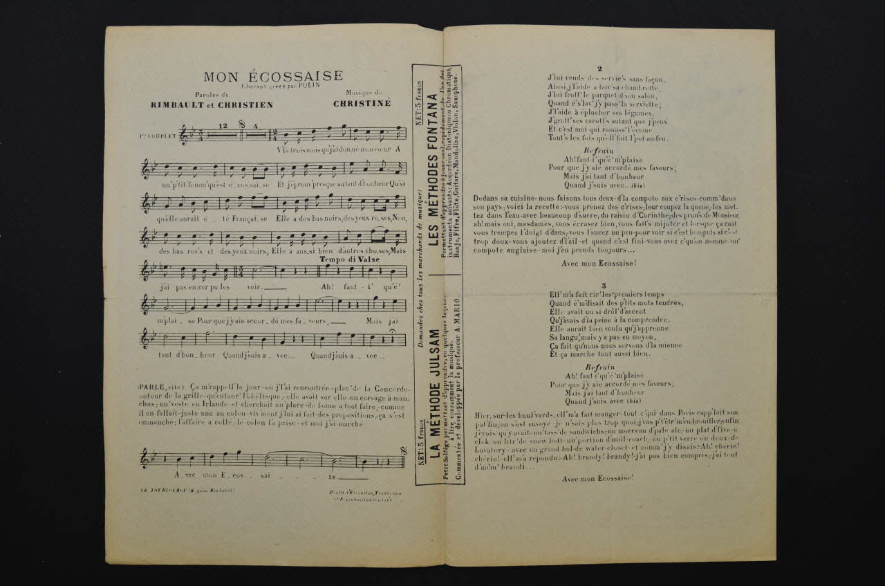 A l'intérieur, partition et paroles de la chanson ; encarts publicitaires sur la tranche.