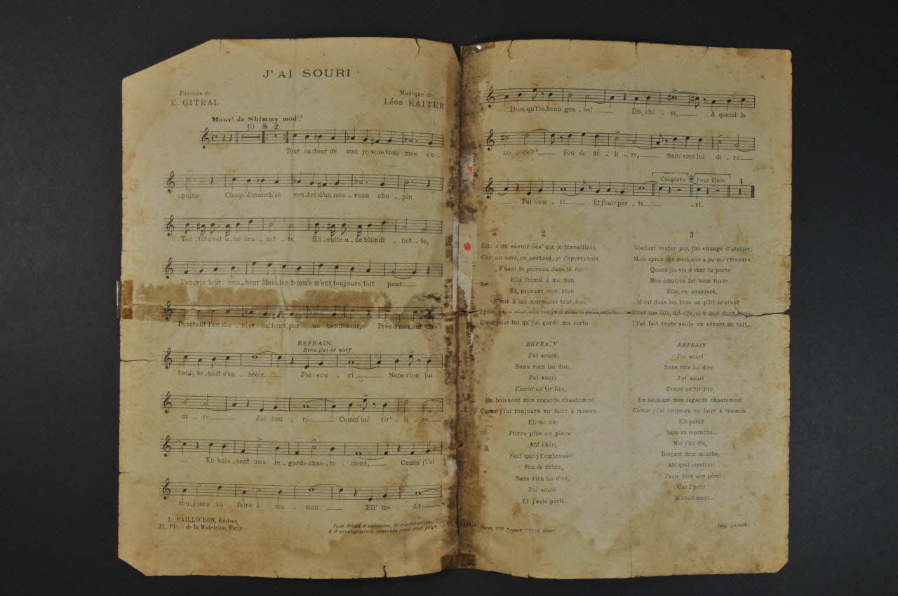 Les inscriptions renseignent le titre de la chanson, le nom des auteurs, de l'artiste et de l'éditeur. A l'intérieur, la partition et les paroles. Au dos, une liste de titres disponibles chez le même éditeur.Décor