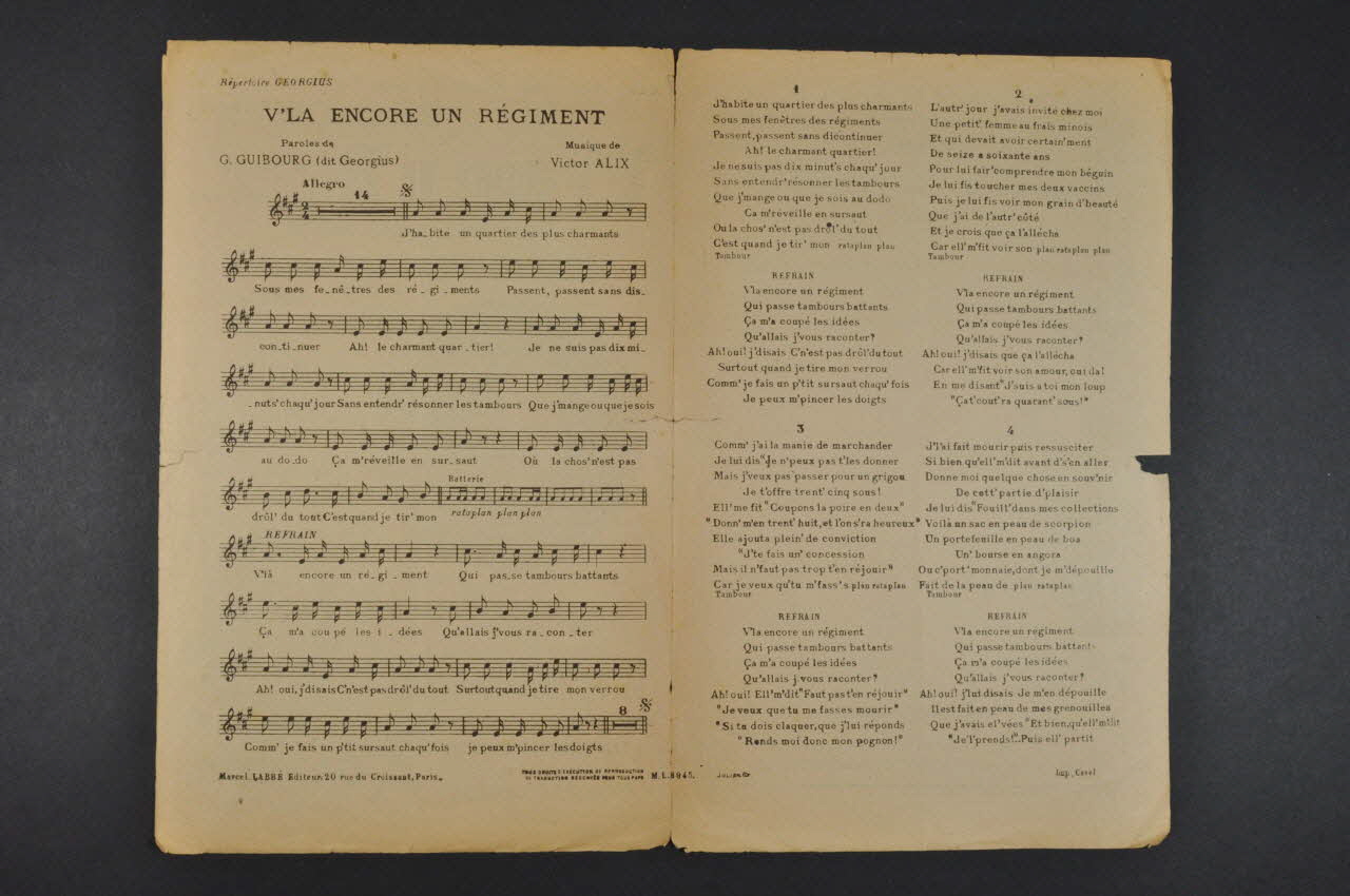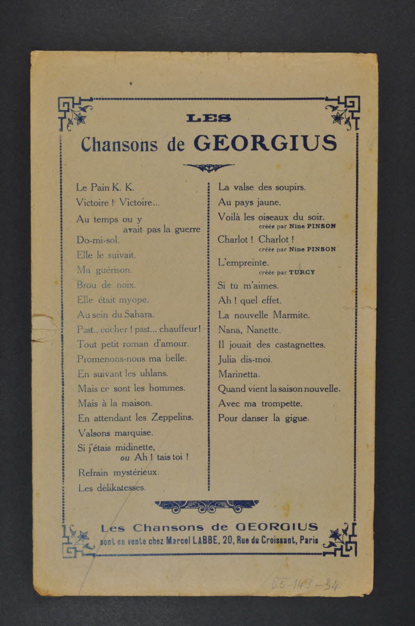Des inscriptions renseignent le titre, les auteurs, les exécutants et l'éditeur. A l'intérieur, partition et paroles de la chanson. Au dos, liste d'autres partitions publiées par l'éditeur.Décor