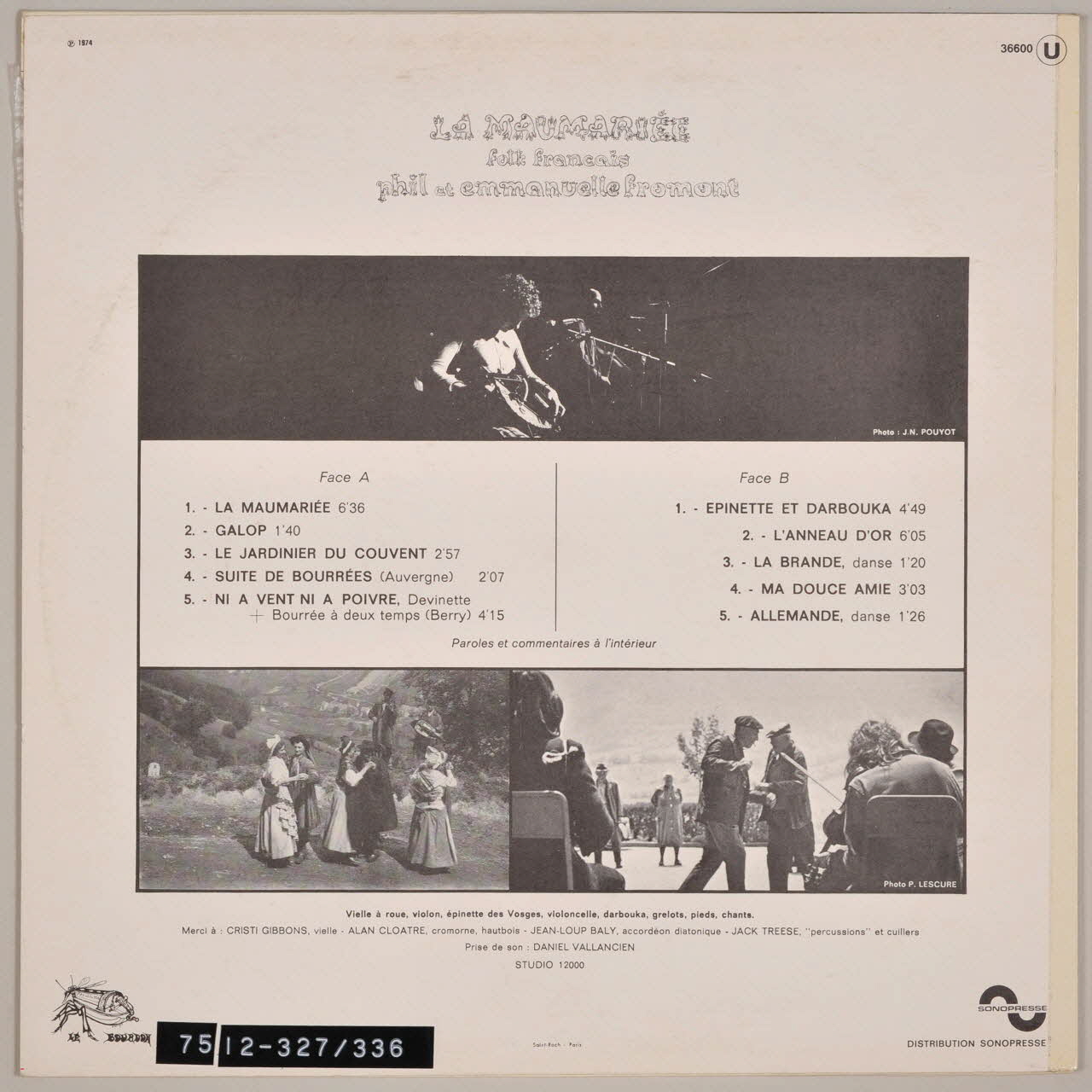 Au verso, des photographies de musiciens et de danseurs. Des inscriptions sur les deux faces de la pochette et sur l'étiquette grise du disque renseignent les titres et les exécutants de l'album.Matériaux et techniques