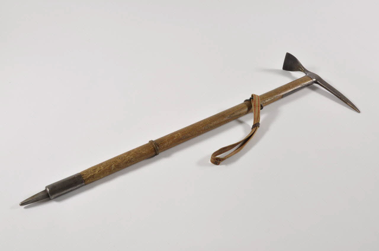 Piolet avec manche en bois ovale comportant en haut une lame pointue dentelée sur le dessous et une lame triangulaire, le tout en acier.
