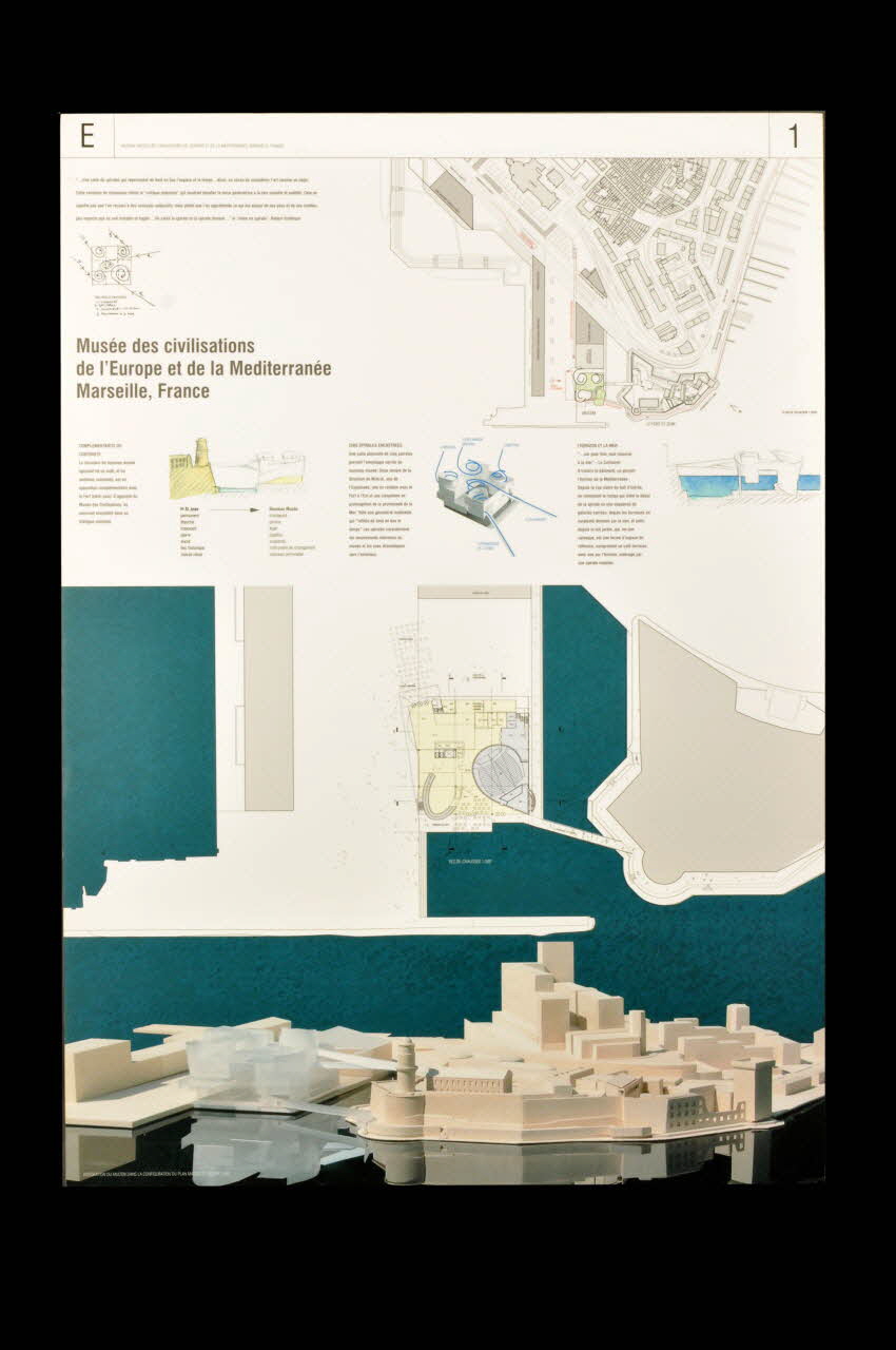 Panneau rectangulaire en carton plume. Il est imprimé sur sa face antérieure qui présente un fond blanc. Le panneau montre le projet du MuCEM qui se compose de deux sites, le vieux fort Saint Jean et le nouveau Musée à l'entrée du Port. Il présente deux plans, quatre schémas et une photographie de la maquette du projet. Le haut du panneau est occupé par un bandeau présentant les numéros de la maquette et son titre. Au-dessous, l'espace du panneau peut être divisé en quatre parties. La partie supérieure comprend à droite un plan de situation du MuCEM dans Marseille, et à gauche un texte de présentation, un shéma, et la reprise du titre en gros caractères. Le plan est en dégradé de gris avec le projet du nouveau musée en vert. Juste en dessous, une partie regroupant trois schémas avec un court texte explicatif pour chacun. Celui de gauche est un dessin du nouveau musée et d'une partie du fort, vus du nord. Une liste de termes opposables est placée sous le dessin. Celui du centre est une modélisation 3D du nouveau musée avec des flèches exprimant les sprirales du projet. Celui de droite est aussi un dessin en coupe du nouveau musée, vu du nord, avec la perspective sur la mer. La troisième partie du panneau est occupée par le plan masse du projet et le plan du rez-de-chaussée du nouveau musée, avec les espaces créés en jaune. La dernière partie est une photographie qui occupe toute la largeur de la page, c'est une vue de la maquette du projet, depuis le sud.Inscriptions
