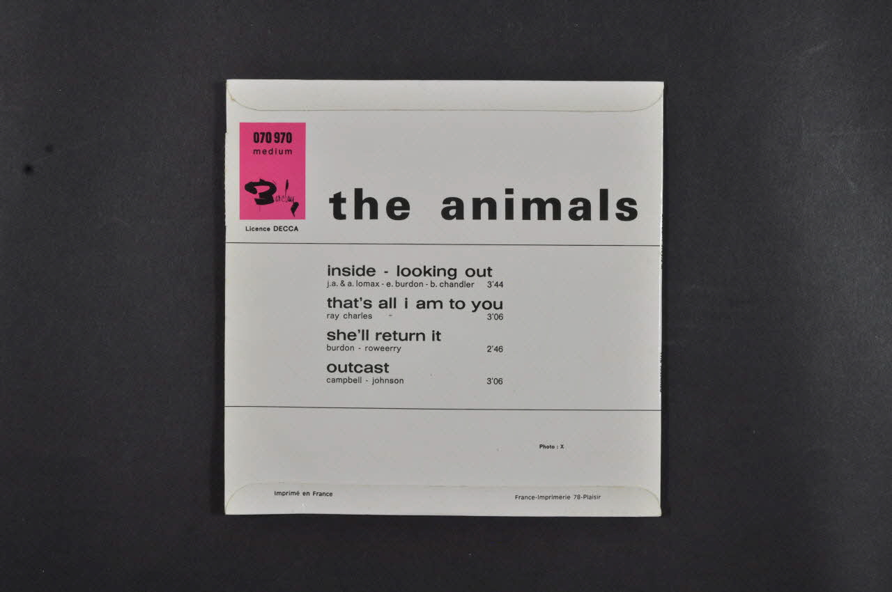 Le recto est sur fond blanc et est illustréd'une photographie de cin jeunes hommes. Au dessus figurent des inscriptions en noir et ocre. Le dos est sur fond blanc et porte des inscriptions en noir avec dans l'angle supérieur gauche le logo de la maison de disque sur fond rose. La pochette contient un disque vinyle (.1) avec une étiquette blanc et orange portant des inscriptions en noir des deux côtés.Matériaux et techniques