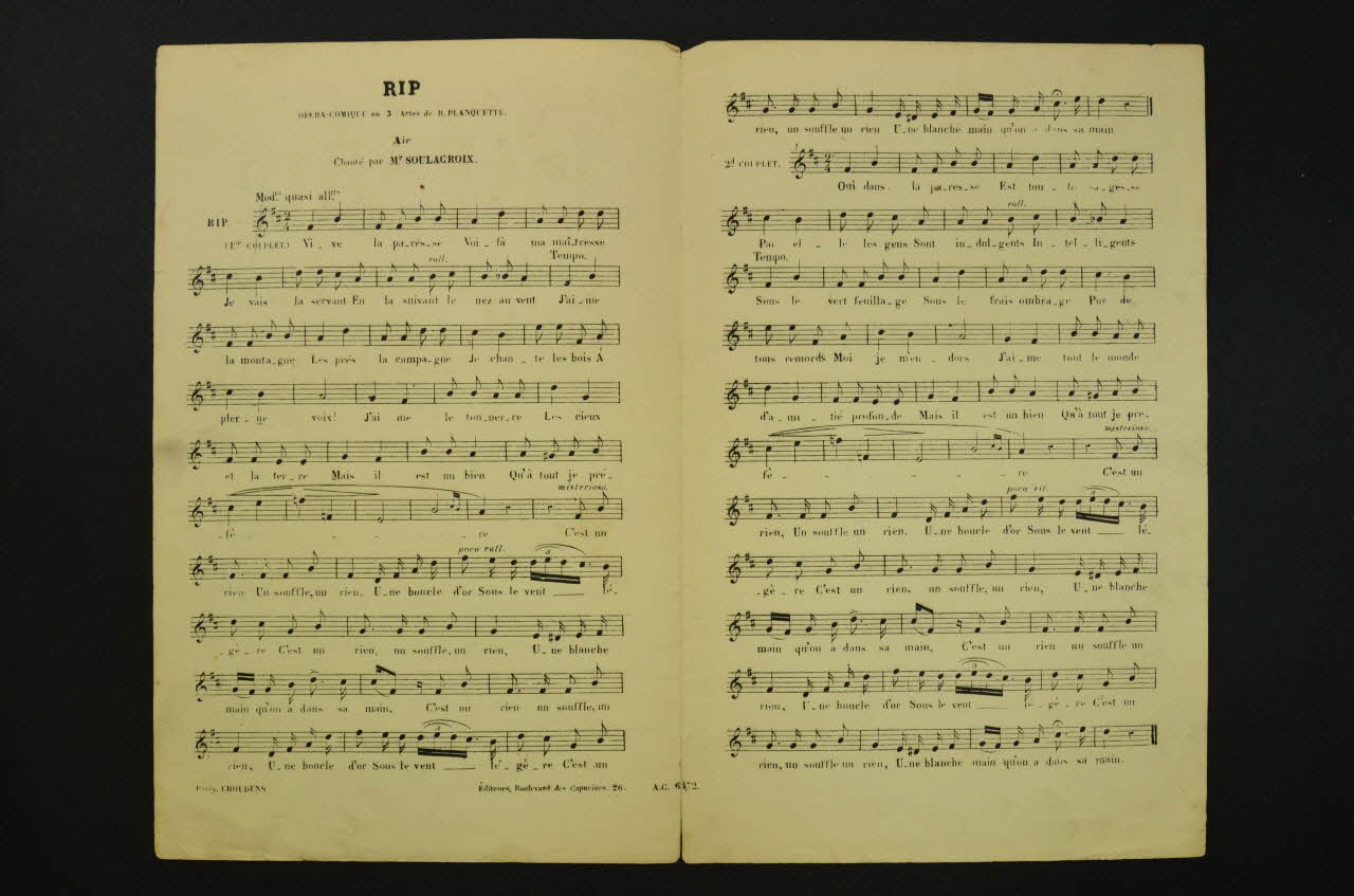 Les inscriptions renseignent le titre de la chanson, le nom des auteurs, de l'artiste et de l'éditeur. A l'intérieur, partitions et paroles de la chanson. Le dos est laissé vierge.Matériaux et techniques
