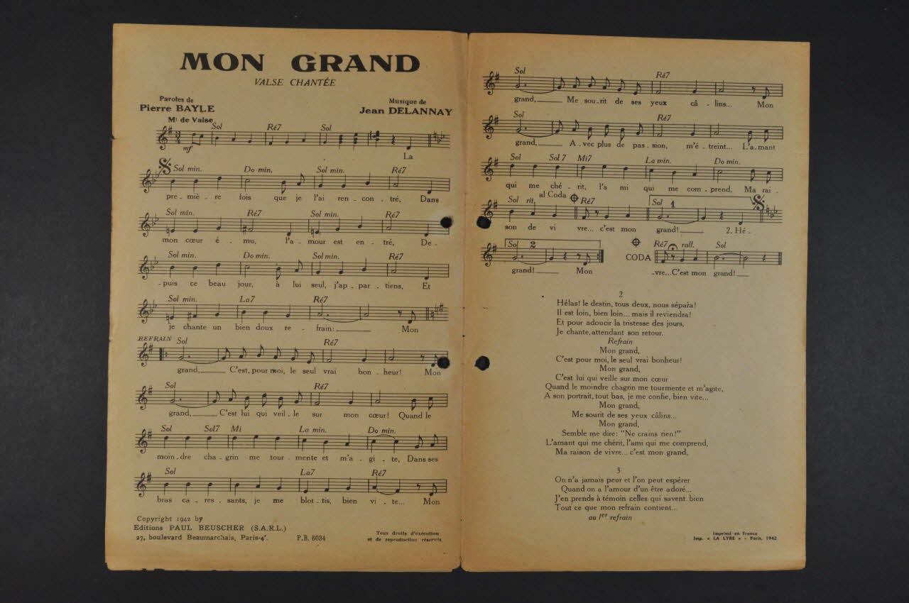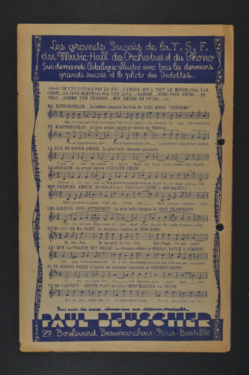 Des inscriptions renseignent le titre, les auteurs, les exécutants et l'éditeur. A l'intérieur, partition et paroles de la chanson. Au dos, liste d'autres partitions publiées par l'éditeur. Le feuillet est perforé à deux reprises près de la tranche.Matériaux et techniques