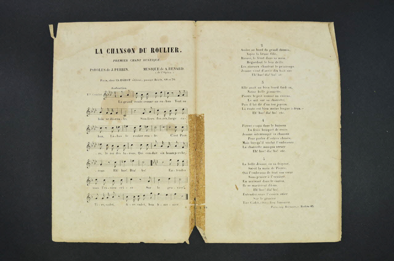 Les inscriptions précisent l'auteur de la chanson, les interprètes et l'éditeur du feuillet. L'intérieur comporte la partition et les paroles. Le dos est laissé vierge.Matériaux et techniques
