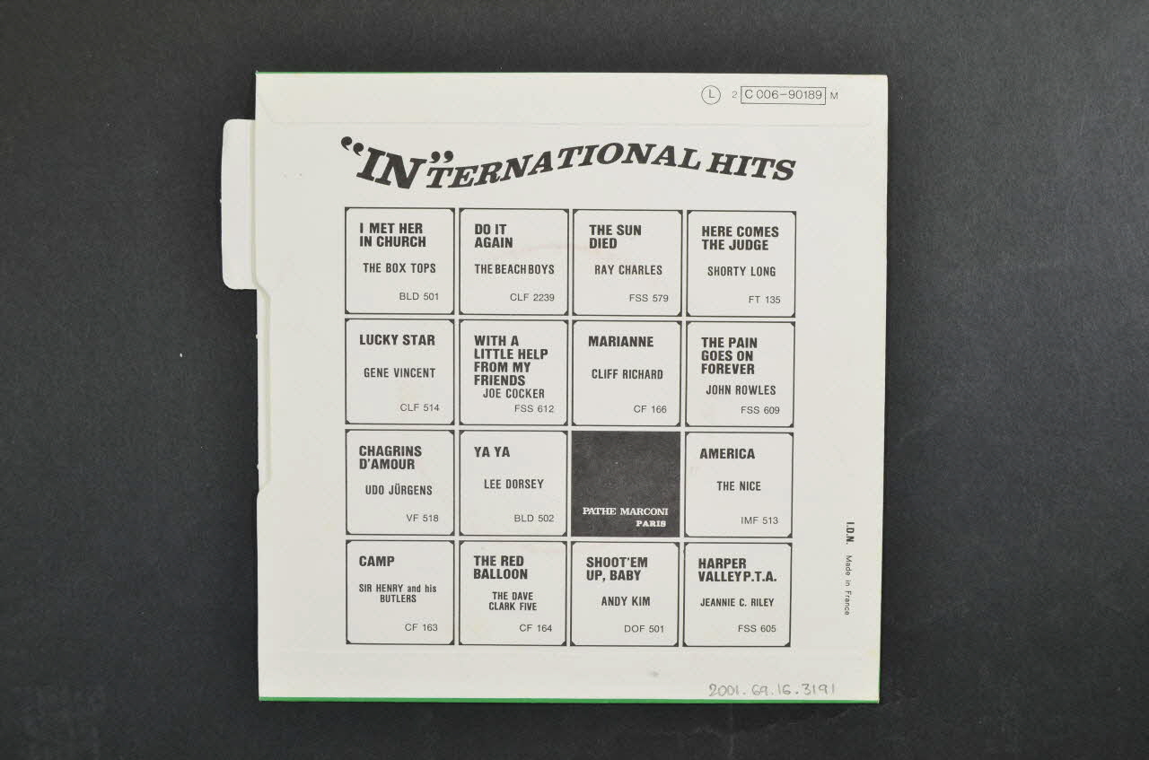 L'arrière comporte seize carrés, dont quinze contenant des titres et références de disques en noir sur blanc. Le seizième contient le nom d'une maison de disques en blanc sur noir.Matériaux et techniques