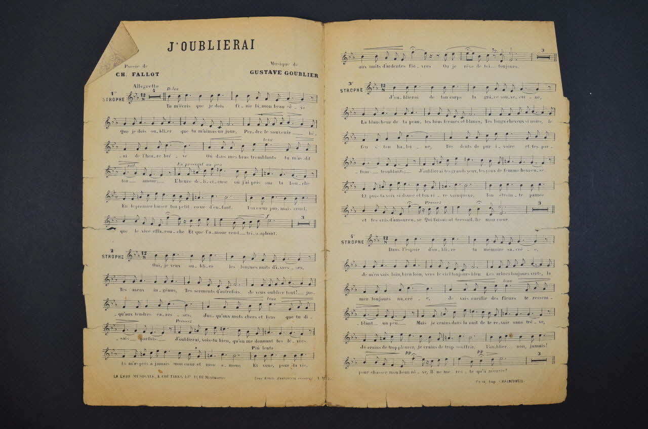 Feuillet rectangulaire en papier industriel imprimé. Le feuillet contient la partition et les paroles de la chanson. Au dos, publicité pour l'éditeur.Décor